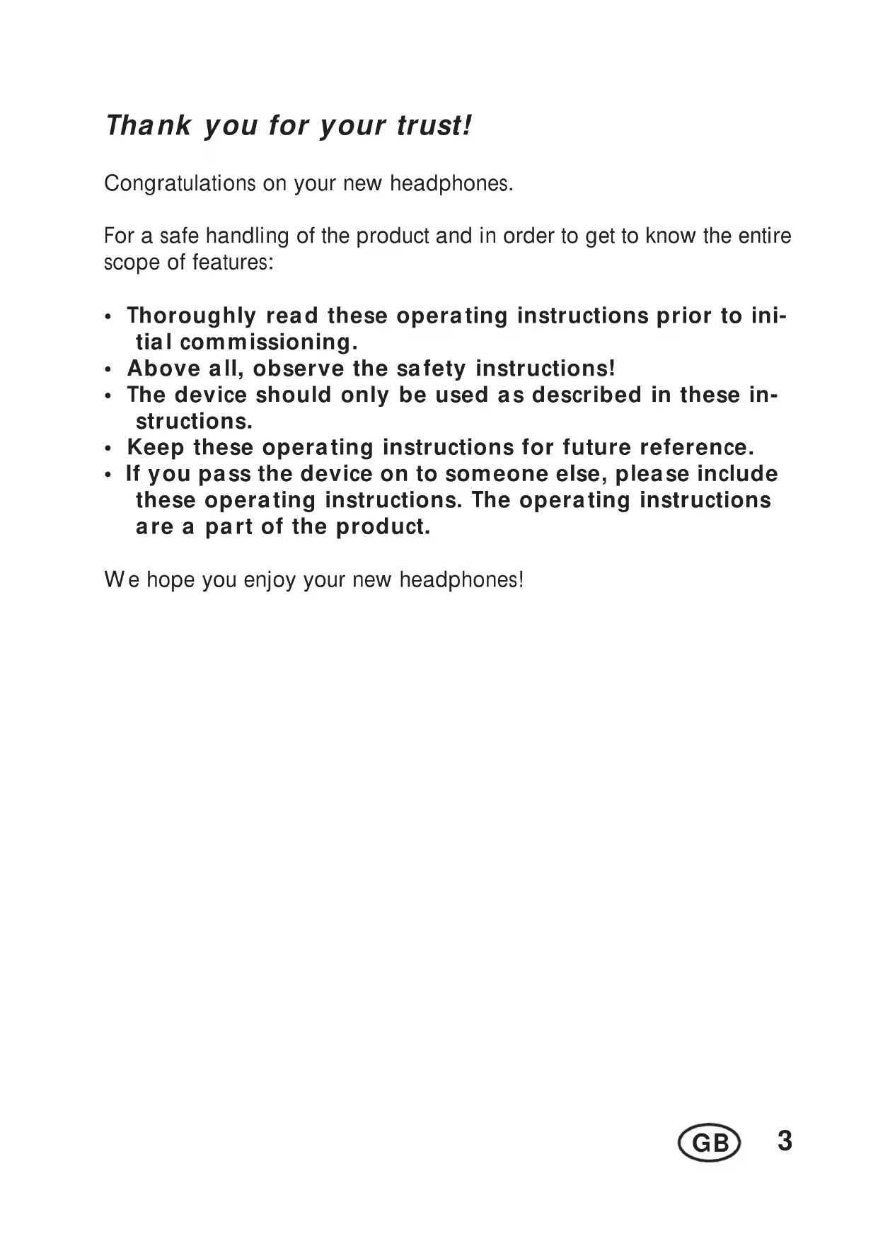 - If you pass the device on to someone else, please include these operating instructions. The operating instructions are a part of the product. We hope you enjoy your new headphones!4