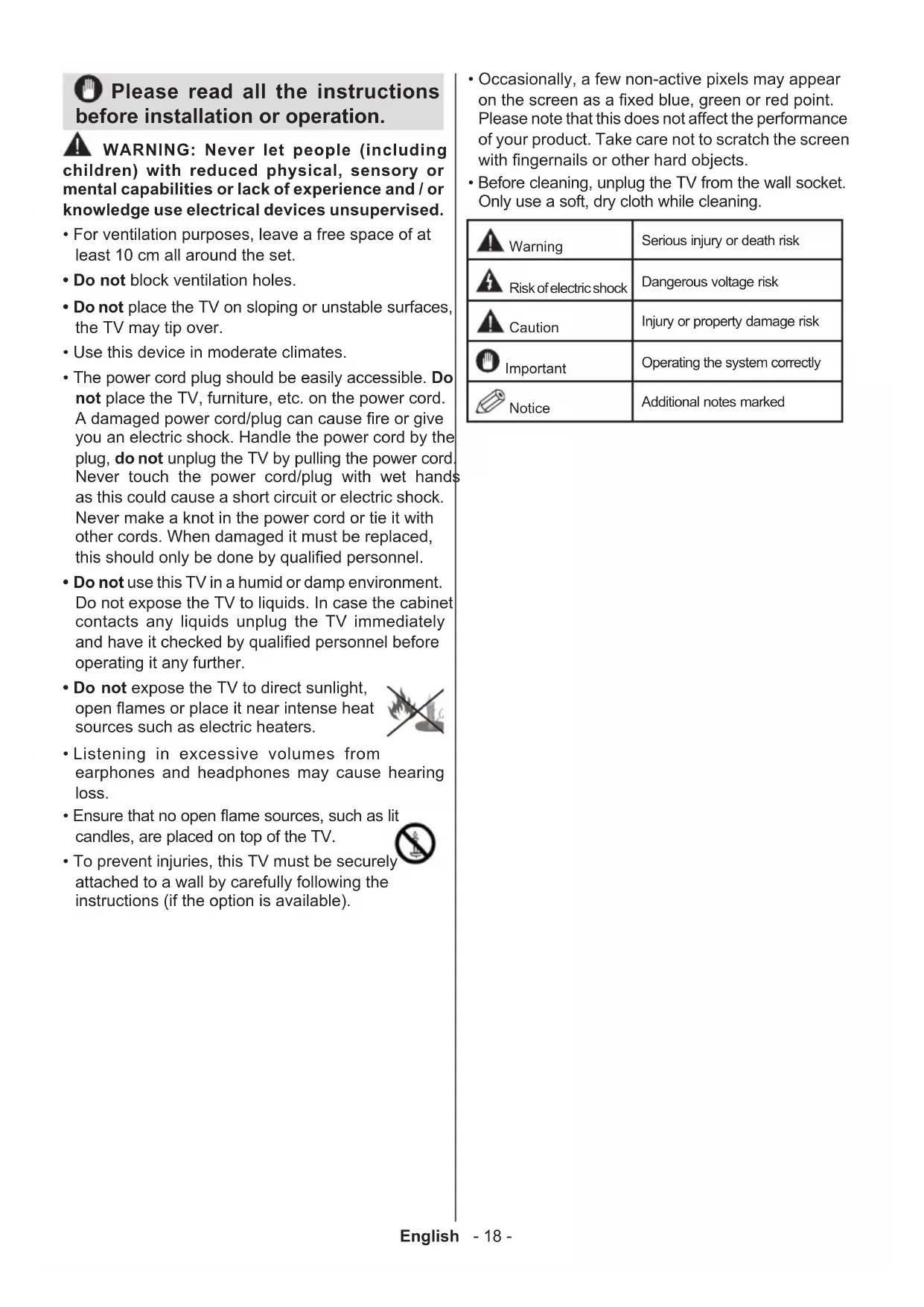 - Before cleaning, unplug the TV from the wall socket. Only use a soft, dry cloth while cleaning. Warning Serious injury or death risk Risk of electric shock Dangerous voltage risk Caution Injury or property damage risk Important Operating the system correctly Notice Additional notes marked Please read all the instructions before installation or operation.