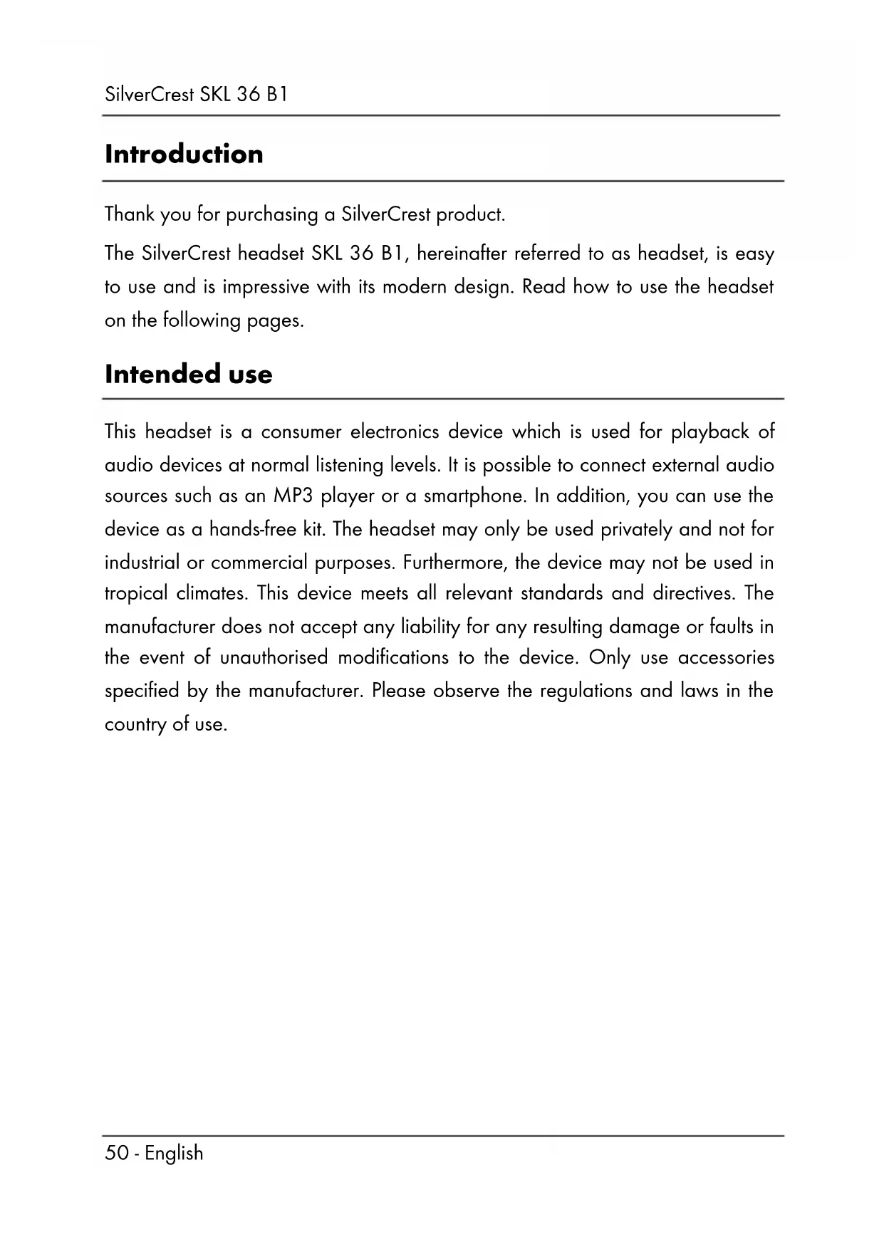 Introduction Thank you for purchasing a SilverCrest product. The SilverCrest headset SKL 36 B1, hereinafter referred to as headset, is easy to use and is impressive with its modern design. Read how to use the headset on the following pages. Intended use This headset is a consumer electronics device which is used for playback of audio devices at normal listening levels. It is possible to connect external audio sources such as an MP3 player or a smartphone. In addition, you can use the device as a hands-free kit. The headset may only be used privately and not for industrial or commercial purposes. Furthermore, the device may not be used in tropical climates. This device meets all relevant standards and directives. The manufacturer does not accept any liability for any resulting damage or faults in the event of unauthorised modifications to the device. Only use accessories specified by the manufacturer. Please observe the regulations and laws in the country of use.SilverCrest SKL 36 B1 English - 51 Supplied items Take the device and all accessories from the packaging. Remove all packaging material and check that all parts are complete and undamaged. In the event of an incomplete or damaged delivery, please contact the manufacturer.