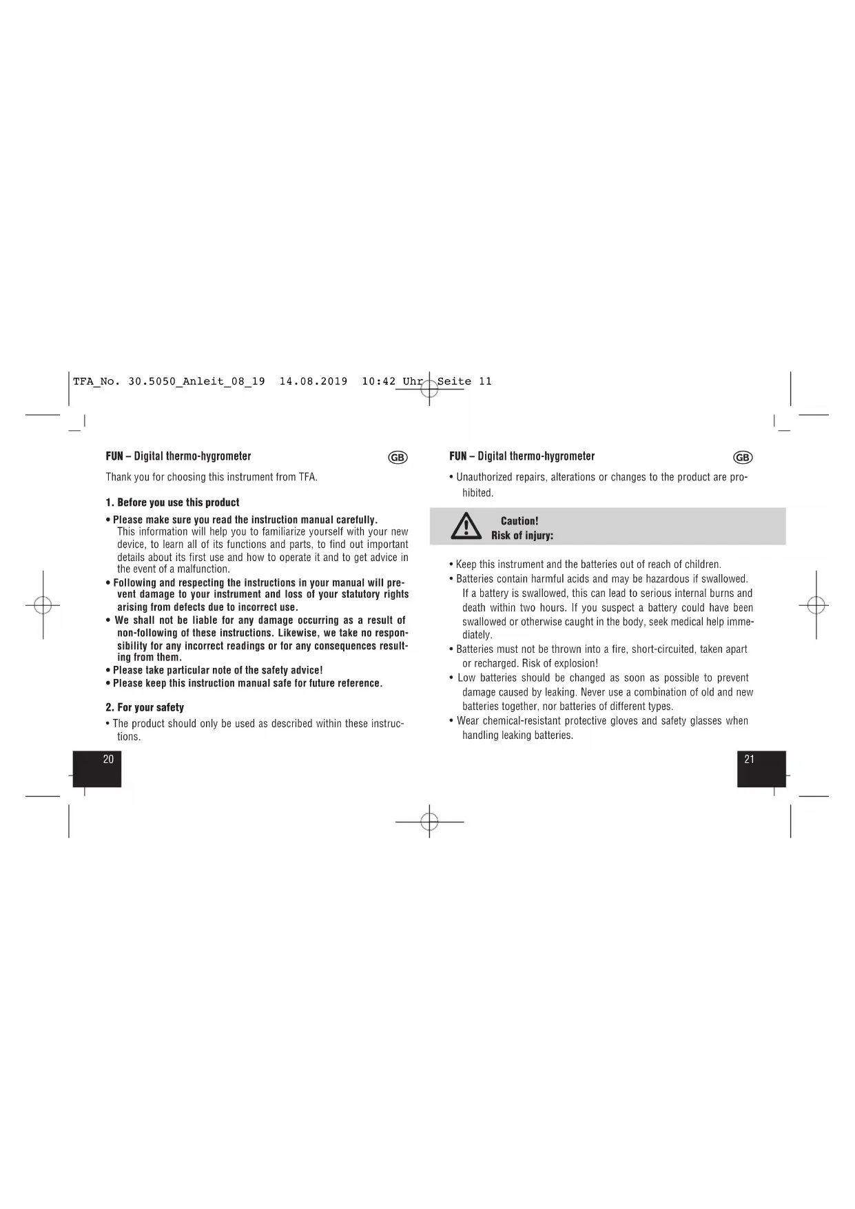 - Wear chemical-resistant protective gloves and safety glasses when handling leaking batteries. Thank you for choosing this instrument from TFA.