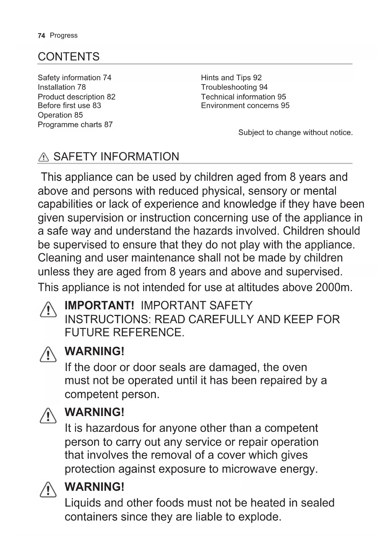 FUTURE REFERENCE. WARNING! If the door or door seals are damaged, the oven must not be operated until it has been repaired by a competent person. WARNING! It is hazardous for anyone other than a competent person to carry out any service or repair operation that involves the removal of a cover which gives protection against exposure to microwave energy. WARNING! Liquids and other foods must not be heated in sealed containers since they are liable to explode. Safety information 74 Installation 78 Product description 82 Before first use 83 Operation 85 Programme charts 87 Hints and Tips 92 Troubleshooting 94 Technical information 95 Environment concerns 95 Subject to change without notice. 4_Progress_EN230_CS_BASE_AB20_SAFETYMAY19_Layout 1 28/03/2019 10:43 Page 74This appliance is intended to be used in household and similar applications such as: staff kitchen areas in shops, offices and other working environments; farm houses; by clients in hotels, motels and other residential environments; bed and breakfast type environments. Only use microwave-safe containers and utensils. Metallic containers for food and beverages are not allowed during microwave cooking. Do not leave the oven unattended when using disposable plastic, paper or other combustible food containers. The microwave oven is intended for heating food and beverages. Drying of food or clothing and heating of warming pads, slippers, sponges, damp cloth and similar may lead to risk of injury, ignition or fire. If food being heated begins to smoke, DO NOT OPEN THE DOOR. Turn off and unplug the oven and wait until the food has stopped smoking. Opening the door while food is smoking may cause a fire. Microwave heating of beverages can result in delayed eruptive boiling, therefore care has to be taken when handling the container. The contents of feeding bottles and baby food jars shall be stirred or shaken and the temperature checked before consumption, in order to avoid burns. Do not cook eggs in their shells and whole hard boiled eggs should not be heated in microwave ovens since they may explode even after microwave cooking has ended. Care and cleaning Door: To remove all trace of dirt, regularly clean both sides of the door, the door seals and sealing surfaces with a soft, damp cloth. Do not use harsh abrasive cleaners or sharp metal