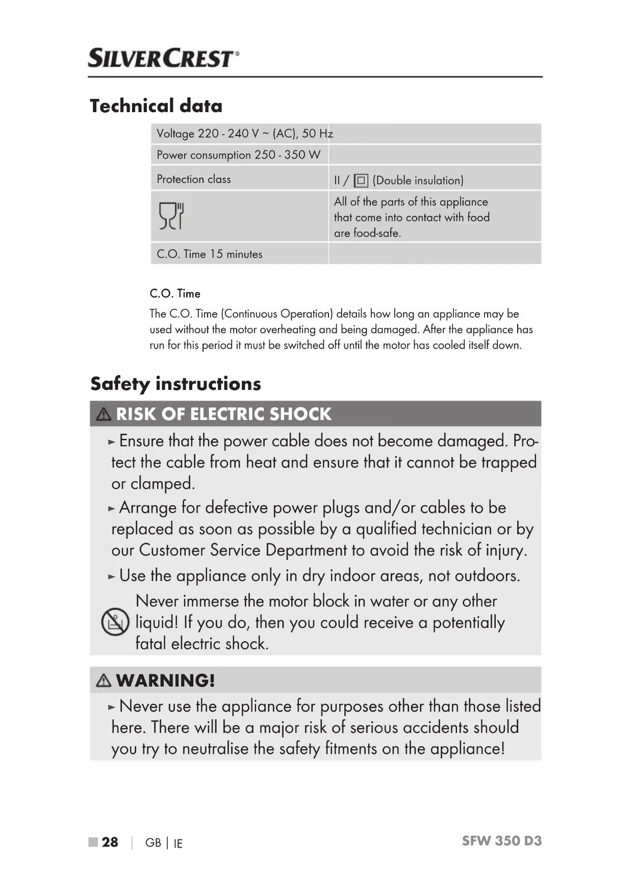 Technical data Voltage 220 - 240 V ∼ (AC), 50 Hz Power consumption 250 - 350 W Protection class II / (Double insulation) All of the parts of this appliance that come into contact with food are food-safe. C.O. Time 15 minutes C.O. Time The C.O. Time (Continuous Operation) details how long an appliance may be used without the motor overheating and being damaged. After the appliance has run for this period it must be switched off until the motor has cooled itself down. Safety instructions