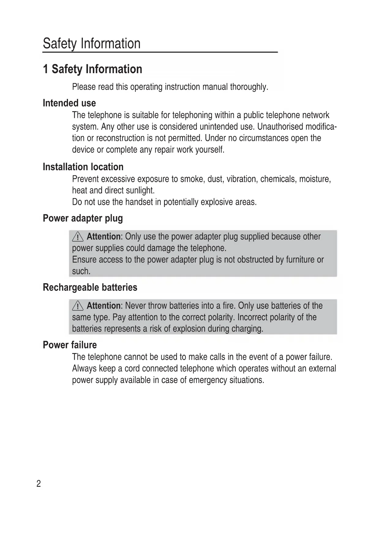 Attention: Never throw batteries into a fire. Only use batteries of the same type. Pay attention to the correct polarity. Incorrect polarity of the batteries represents a risk of explosion during charging. Power failure The telephone cannot be used to make calls in the event of a power failure. Always keep a cord connected telephone which operates without an external power supply available in case of emergency situations.3