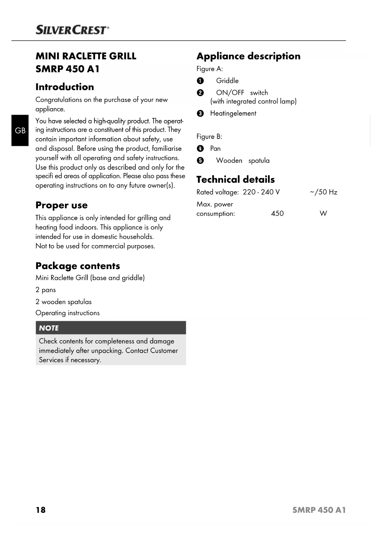 SMRP 450 A1 Introduction Congratulations on the purchase of your new appliance. You have selected a high-quality product. The operat- ing instructions are a constituent of this product. They contain important information about safety, use and disposal. Before using the product, familiarise yourself with all operating and safety instructions. Use this product only as described and only for the specifi ed areas of application. Please also pass these operating instructions on to any future owner(s). Proper use This appliance is only intended for grilling and heating food indoors. This appliance is only intended for use in domestic households. Not to be used for commercial purposes. Package contents Mini Raclette Grill (base and griddle) 2 pans 2 wooden spatulas Operating instructions NOTE Check contents for completeness and damage immediately after unpacking. Contact Customer Ser vices if necessary. Appliance description Figure A: 1 Griddle 2 ON/OFF switch (with integrated control lamp)