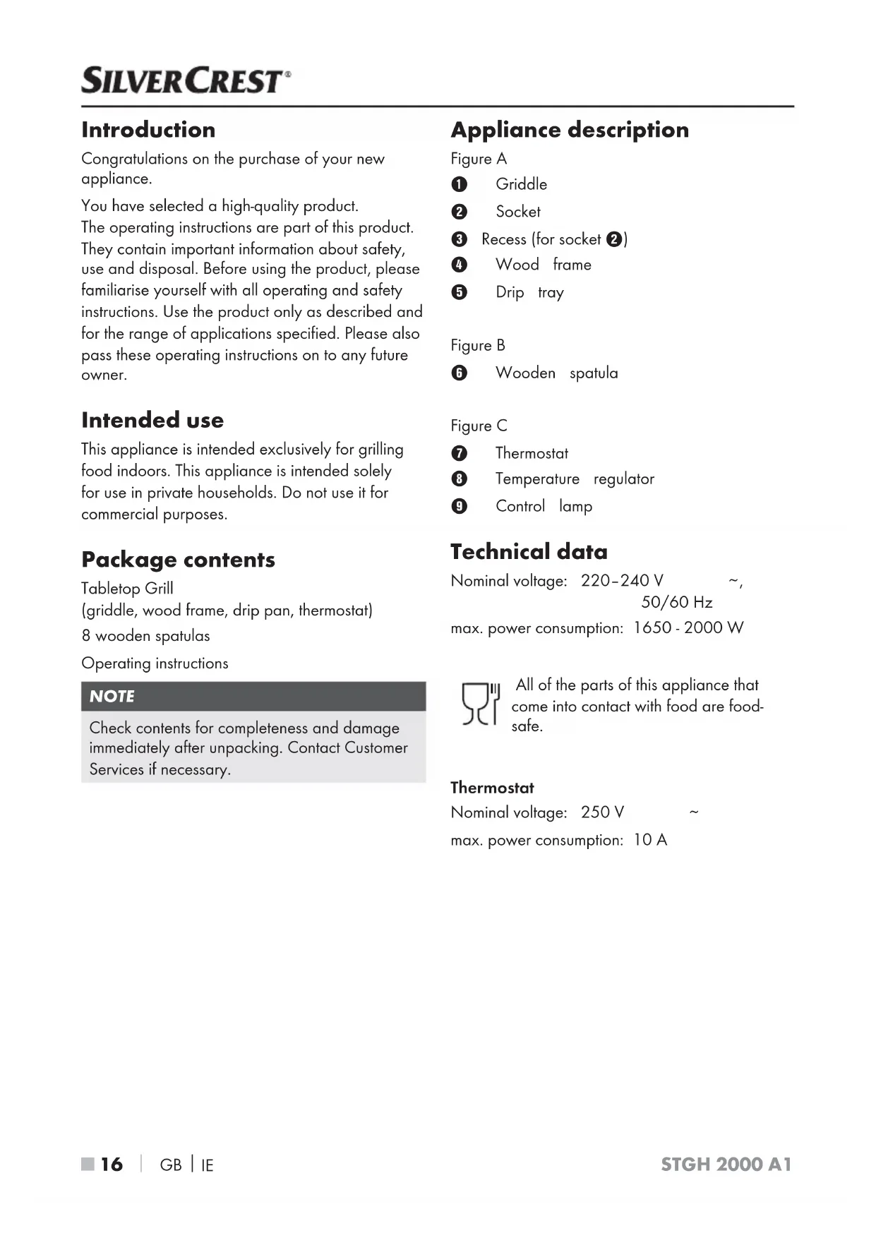 STGH 2000 A1 Introduction Congratulations on the purchase of your new appliance. You have selected a high-quality product. The operating instructions are part of this product. They contain important information about safety, use and disposal. Before using the product, please familiarise yourself with all operating and safety instructions. Use the product only as described and for the range of applications specified. Please also pass these operating instructions on to any future owner. Intended use This appliance is intended exclusively for grilling food indoors. This appliance is intended solely for use in private households. Do not use it for commercial purposes. Package contents Tabletop Grill (griddle, wood frame, drip pan, thermostat) 8 wooden spatulas Operating instructions NOTE Check contents for completeness and damage immediately after unpacking. Contact Customer Services if necessary. Appliance description Figure A Griddle Socket Recess (for socket ) Wood frame Drip tray Figure B Wooden spatula Figure C Thermostat Temperature regulator Control lamp Technical data Nominal voltage: 220–240 V