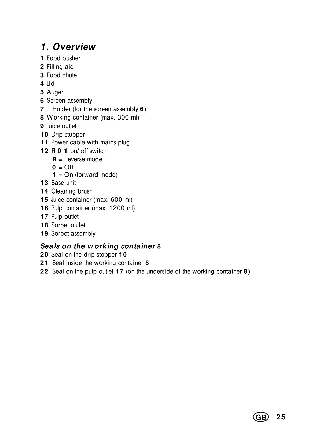 1 Food pusher 2 Filling aid 3 Food chute 4 Lid 5 Auger 6 Screen assembly 7 Holder (for the screen assembly|6) 8 Working container (max. 300 ml) 9 Juice outlet 10 Drip stopper 11 Power cable with mains plug 12 R 0 1 on/off switch R = Reverse mode 0 = Off 1 = On (forward mode) 13 Base unit 14 Cleaning brush 15 Juice container (max. 600 ml) 16 Pulp container (max. 1200 ml) 17 Pulp outlet 18 Sorbet outlet 19 Sorbet assembly Seals on the working container|8 20 Seal on the drip stopper|10 21 Seal inside the working container|8 22 Seal on the pulp outlet|17 (on the underside of the working container|8)26
