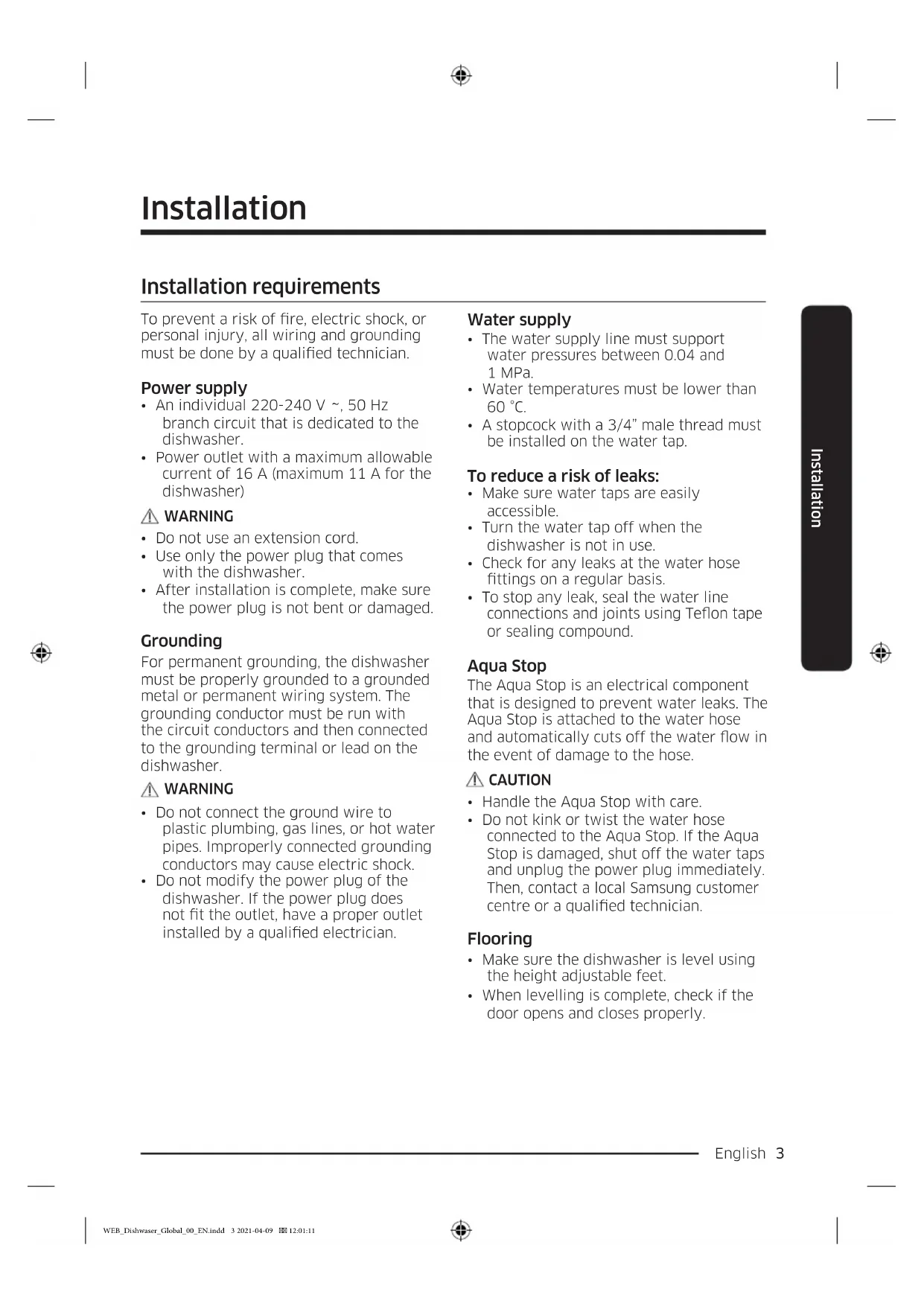 Dishwasher Eco Design Guide WEB_Dishwaser_Global_00_EN.indd 1 2021-04-09 12:01:11English2 Contents Contents Installation 3 Installation requirements 3 Before you start 4 Using Detergent 4 Using Rinse 9 Using Softener 12 Operations 14 Cycle overview 14 Energy, water saving tip 15 Cycle chart 16 Maintenance 23 Cleaning 23 Troubleshooting 27 Checkpoints 27 Information codes 30 WEB_Dishwaser_Global_00_EN.indd 2 2021-04-09 12:01:11English 3 Installation Installation Installation requirements To prevent a risk of re, electric shock, or personal injury, all wiring and grounding must be done by a qualied technician. Power supply
