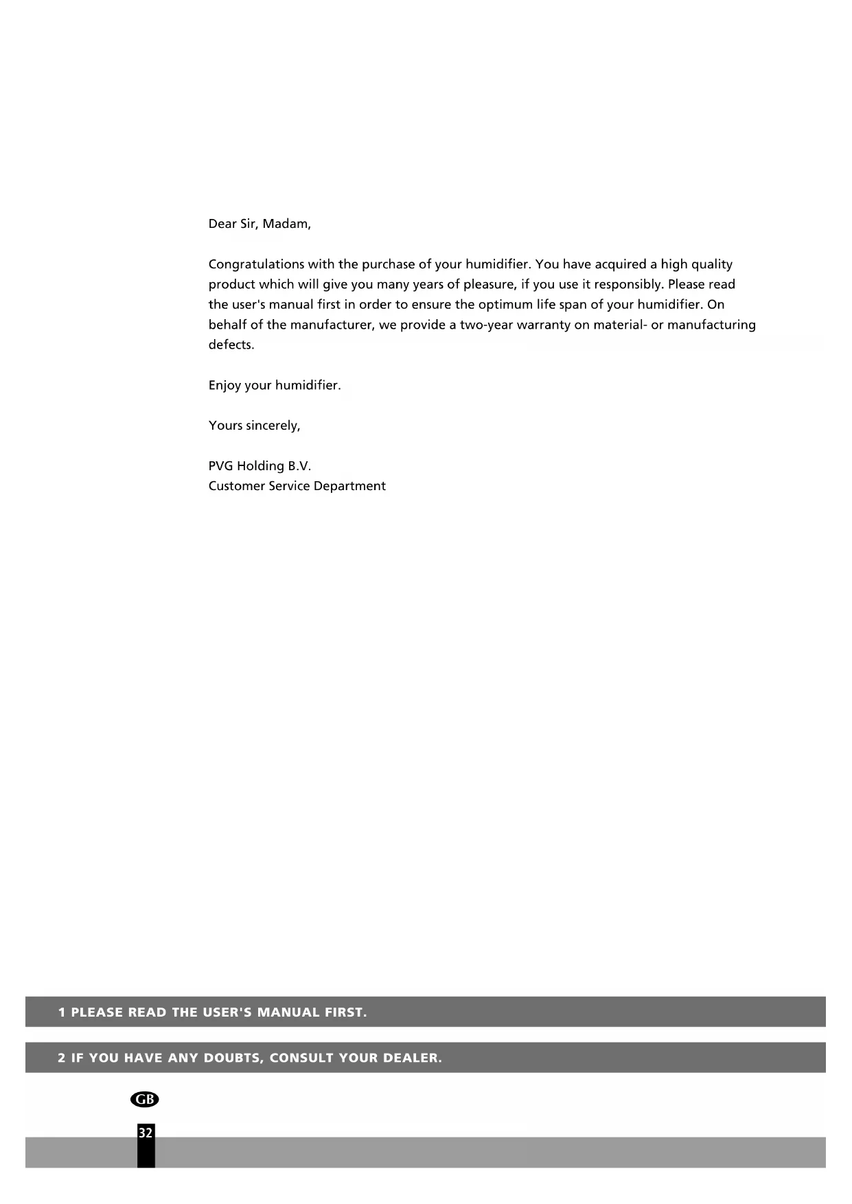 - The warranty will expire if any alterations have been made, not genuine components have been fitted or if the humidifier has been repaired by a third party.