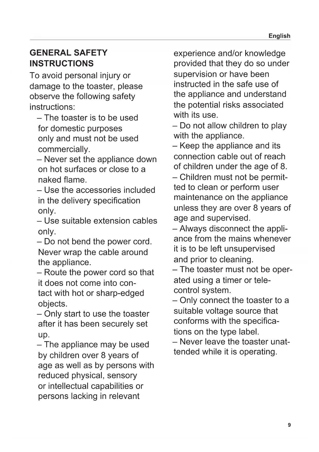 SYMBOLERKLÄRUNG Symbol Erklärung CE-Kennzeichnung: Das Produkt ist konform mit den geltenden Anforderungen der Europäischen Union. Das Produkt wurde nach dem 13. August 2005 in Verkehr gebracht. Es darf nicht über den normalen Hausmüll entsorgt werden. Das Symbol der durchgestrichenen Mülltonne weist auf die Notwendigkeit der getrennten Sammlung hin. Für den Kontakt mit Lebensmitteln geeignet9 GENERAL SAFETY INSTRUCTIONS To avoid personal injury or damage to the toaster, please observe the following safety instructions: – The toaster is to be used for domestic purposes only and must not be used commercially. – Never set the appliance down on hot surfaces or close to a naked ame. – Use the accessories included in the delivery specication only. – Use suitable extension cables only. – Do not bend the power cord. Never wrap the cable around the appliance. – Route the power cord so that it does not come into con- tact with hot or sharp-edged objects. – Only start to use the toaster after it has been securely set up. – The appliance may be used by children over 8 years of age as well as by persons with reduced physical, sensory or intellectual capabilities or persons lacking in relevant experience and/or knowledge provided that they do so under supervision or have been instructed in the safe use of the appliance and understand the potential risks associated with its use. – Do not allow children to play with the appliance. – Keep the appliance and its connection cable out of reach of children under the age of 8. – Children must not be permit- ted to clean or perform user maintenance on the appliance unless they are over 8 years of age and supervised. – Always disconnect the appli- ance from the mains whenever it is to be left unsupervised and prior to cleaning. – The toaster must not be oper- ated using a timer or tele- control system. – Only connect the toaster to a suitable voltage source that conforms with the specica- tions on the type label. – Never leave the toaster unat- tended while it is operating. English10 Risk of electric shock – Always remove the power plug from the socket in the event of a malfunction, before cleaning and when the toaster is not in use. When doing so, pull on the plug and not on the cable. – Never immerse the toaster in water. Never expose the toaster to rain or any other form of moisture. If the toaster falls into water, unplug the cable from the mains socket before removing the toaster from the water. Have the toaster inspected at an author- ized service location before using it again. – Always ensure that your hands are completely dry before using the toaster. Do not use the toaster if it is wet or damp or while you are standing on a damp surface. Do not use the toaster outdoors. – Stop using the appliance immediately if any parts are damaged and contact the ritter after-sales service. – If the power cord is damaged, it must be replaced by the manufacturer, the manufac- turer's after-sales service or a similarly qualied person to eliminate risk of personal injury. – The heating wires are sup- plied with mains power dur- ing operation. Therefore, you should never place any metal objects in the toaster. Risk of burns – The outer surfaces of the toaster may become very hot while the toaster is in operation. Always allow the toaster to cool down a little before touching it (e.g. prior to cleaning). – The bread and roll rack may become very hot. Always use the slide bar to raise or col- lapse the bread and roll rack. – Freshly toasted or warmed-up bread can be very hot. You should therefore only remove the bread from the toaster when it has cooled down slightly. English11 Risk of re Bread can burn. It is therefore not inconceivable that bread may catch re while the toaster is operating. Please observe the following re safety instructions: – Do not operate the toaster near or below ammable material such as curtains. – Never cover the toasting slot while the toaster is in use. – Never use this appliance to toast dried breads such as crisp bread, melba toast etc. – Never use the toaster to toast bread covered in any kind of coating. – Never place bread rolls directly over the toasting slot. Always place bread rolls on the bread and roll rack provided. – Allow the toaster at least 30 seconds to cool down after each use. – Empty the crumb tray after each use. English12 Unfold the graphics in the front of the book. Please read these instructions thoroughly before you start to use the toaster. Keep these operating instructions in a safe place and ensure that they are included with the toaster if passing it on to a third party. Alternatively, the current oper- ating instructions are available at www.ritterwerk.de. INTENDED USE This toaster is intended to be used exclusively for the toast- ing of sliced bread and bread rolls that are suitable for toast- ing in a domestic setting and on a domestic scale. The toaster is suitable for contact with foodstus. If the appliance is used for a purpose other than this, or if it is operated incorrectly, severe injuries may occur or the toaster may be damaged. All warranty and liability claims will be rendered null and void in this case. FUNCTIONS The toaster includes an auto- centring function. Toasting The toasting function allows you to toast bread to your desired toasting degree. Reheating The reheating function allows you to reheat cold bread that has already been toasted. The reheating process takes approximately 30 seconds. Defrosting The defrost function allows you to thaw frozen slices of bread and toast them to the desired degree in a single process. Warming-up The integrated bread and roll rack allows you to warm up bread rolls for an oven-fresh taste. LED DISPLAY The LED display provides information about the function that is currently in use: Toasting When you begin toasting, the LED indicators light up to indicate the toasting degree selected. You can cong