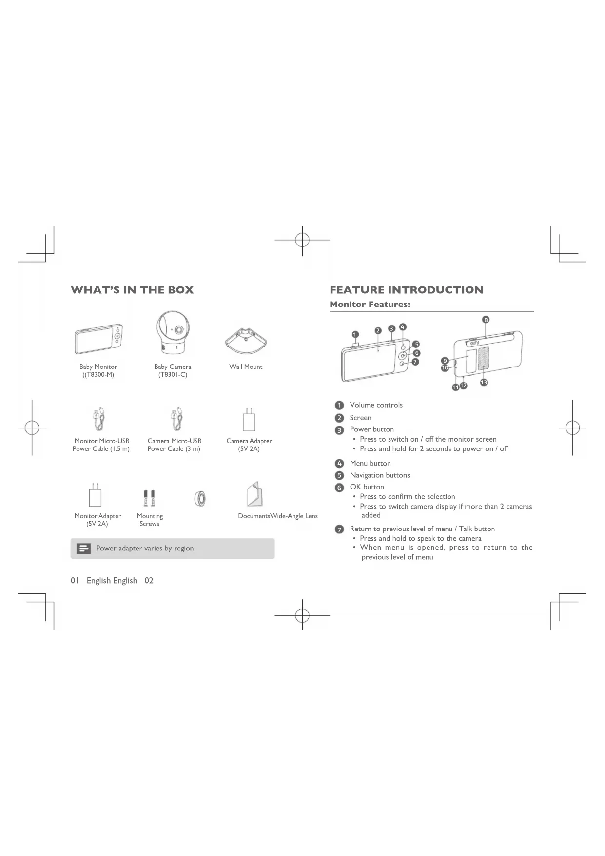 Table of Contents What’s in the Box 01 Feature Introduction 02 Setting Up the Camera and Monitor 04 Adding a Camera to the Baby Monitor 05 Placing the Camera (Wall Mount & Corner Mount) 06 Monitor Menu Settings 07 Replacing the Camera Lens 12 Notice 1301 English English 02
