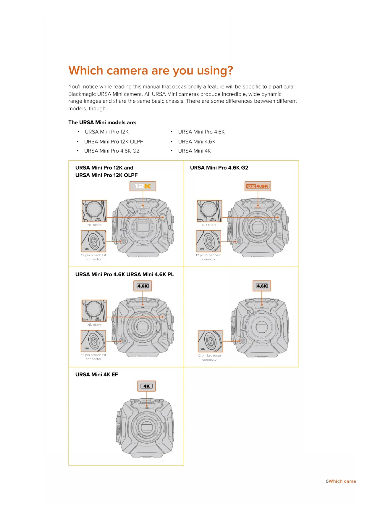 URSA Mini Pro 12K, left side URSA Mini Pro 4.6K G2, left side 7Which camera are you using?URSA Mini Pro 4.6K, left side URSA Mini Aside from the sensors used, URSA Mini 4K and 4.6K models are nearly identical. The control buttons and software menus are laid out the same way, and operating the cameras is essentially the same. You’ll simply find a few more resolution options on cameras using the 4.6Ksensor, together with a greater range of ISO settings. An easy way to tell which sensor your camera has is to look for a ‘4K’ or ‘4.6K’ icon above the lens mount. URSA Mini, left side It’s also worth noting that URSA Mini cameras are available with EF and PL lens mounts. Aneasy way to tell the difference between these is the presence of a 12 pin broadcast lens connector near the lens mount on PL models, and of course, the mounts themselves if you are familiar with EF and PL mounting systems. See the ‘getting started’ section for more information on these mounts. Now that you know how to identify the different URSA Mini models, you can get started usingyour camera! 8Which camera are you using?Getting Started Getting started with your Blackmagic URSA Mini is as simple as mounting a lens, and powering your camera. Attaching a Lens Attaching a lens to your camera is the same process for all URSA Mini cameras, however the EF, PL, B4 and F mounts have slightly different ways of operating. In all cases, the first step is to remove the protective dust cap. To remove the protective dust cap from the EF lens mount, hold down the locking button and rotate the cap counterclockwise until it is released. For the PL and B4 mount lenses, rotate the locking ring counterclockwise and pull the protective dust cap away from the mount. For the F mount, hold down the locking button and rotate the cap clockwise until it is released. NOTE Blackmagic URSA Mini Pro features an interchangeable lens mount capable of accepting EF, PL, B4 and F mount lenses, as well as additional lens mounts with accessories. Formore information on switching between mount types on URSAMiniPro, refer to the ‘interchangeable lens mount’ section in this manual. TIP URSA Mini Pro 12K models are packaged with a PL mount installed. Other URSA Mini Pro cameras come out of the box configured to accept EF lenses. To get shooting right away, simply attach a lens as detailed below. To attach an EF mount lens: Attaching and removing an EF mount lens on Blackmagic URSA Mini EF 1 Align the dot on your lens with the dot on the camera mount. Many lenses have a visual indicator, for example a blue, red or white dot. 2 Insert the lens into the mount and twist clockwise until it locks into place. 9Getting Started3 To remove the lens, hold down the locking button, rotate the lens counterclockwise until itsdot or indicator reaches the 12 o’clock position, and gently remove. To attach a PL mount lens: Attaching and removing a PL lens on Blackmagic URSA Mini PL and URSA Mini Pro 12K models 1 Open your camera’s PL locking ring by rotating it counterclockwise until it stops. 2 Align one of the lens’ four flange notches with the locating pin on the camera mount. Besure to align the lens for easy viewing of the lens marks. 3 Tighten the PL locking ring by rotating it clockwise. If attaching a PL lens with a servo unit toURSA Mini PL or URSA Mini Pro, you can also connect the 12 pin broadcast connector forservo control. 4 To remove the lens, rotate the locking ring counterclockwise until it stops, then gently remove the lens by pulling it directly out from the camera body. There is no need to rotate the lens. 10Getting StartedURSA Mini Pro PL Mount URSA Mini Pro’s PL mount features four pins at the 12 o’clock position that are used to communicate with lenses featuring Cooke’s /i Technology interface. The lenses that support this interface include lenses from Canon, Cooke, Fujinon, Leica and Zeiss. Thislets you record lens information in your clips’ metadata such as the lens model, focal length, aperture setting, focus distance and other lens specific information. When mounting a PLlens with /iTechnology to URSAMini Pro, make sure the lens pins align withthe mount pins at the 12o'clock position The information that is recorded as metadata via Cooke’s /i Technology interface canbe very helpful in post production and VFX. Knowing the lenses used in productionand their precise settings can be helpful in the event that the setup needsto be replicated at a later date. This detailed information can also be utilized by powerful applications such as DaVinciResolve and Blackmagic Fusion for a wide variety of advanced functions. Forexample, the recorded metadata can be used to simulate the specific lens in 3Dspace, or correct lensdistortions. URSA Mini Pro and URSA Mini PL support control of PL 35mm lenses with servo handgrips. When the lens is plugged in to the 12-pin broadcast connector on the camera, URSAMini will provide power and control signals to your lens in the same way it does with B4lenses. For more information refer to the ‘Using Servo Zoom Lenses’ section in this manual. NOTE When no lens is attached to the camera, the glass filter covering the sensor isexposed to dust and other debris. Ensure that you keep the dust cap on whenever possible. 11Getting StartedTo attach a B4 mount lens: Attaching and removing a B4 lens on BlackmagicURSA Mini PL with B4 mount 1 Turn the B4 lens locking ring counterclockwise to reveal the alignment slot inside the top of the mount. Align the B4 lens to your URSA Mini’s B4 mount so the alignment pin on the lens mount matches the position of the alignment slot. 2 Hold the lens against the B4 mount so the mount plates are against each other. 3 Make sure the alignment pin is secured inside the alignment slot. 4 Turn the locking ring clockwise to tighten the lens against the mount and lock it into position. 5 To power the lens and provide lens control, simply plug the lens cable into the connector ma