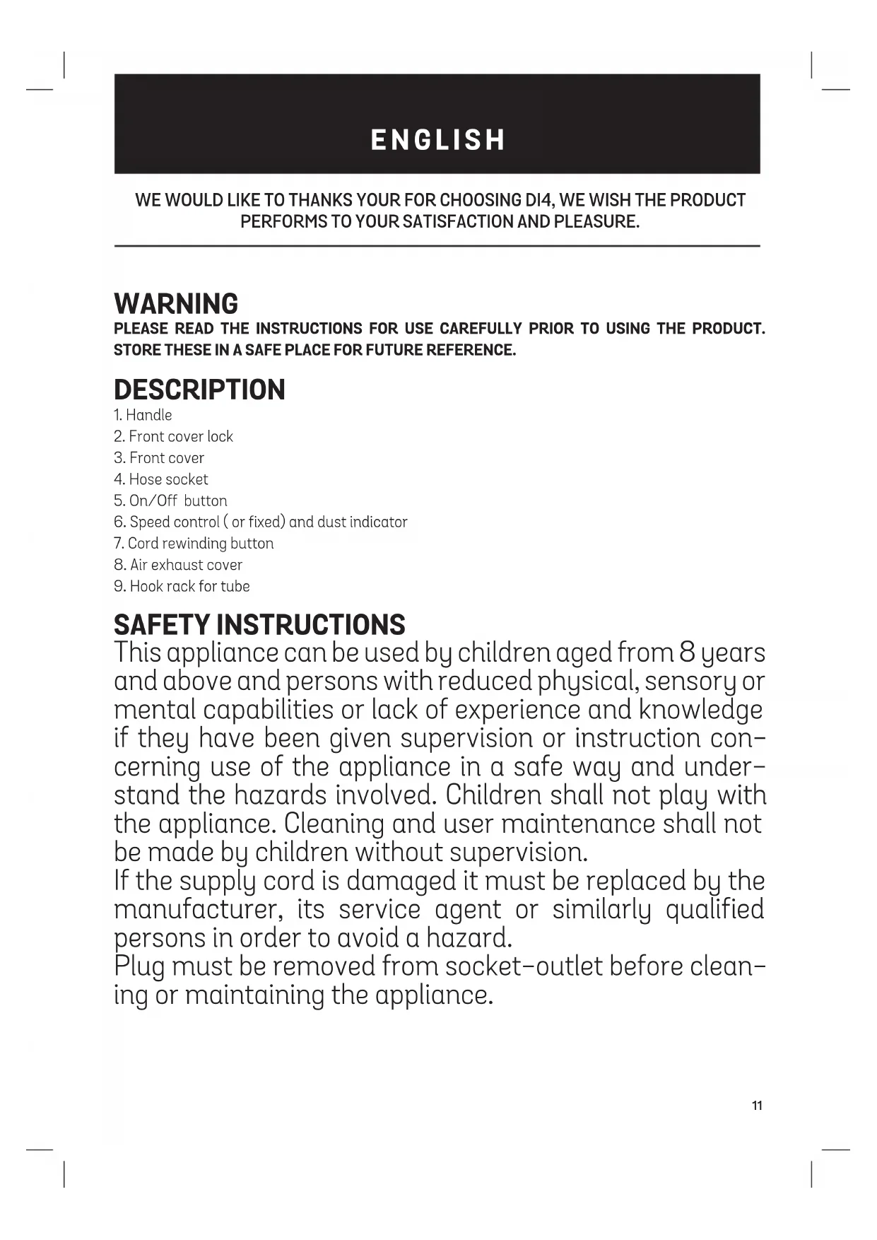 Power cable not connected. ON/OFF key off The cable or plug may be damaged Connect the power cable to a suitable electrical outlet. Switch the ON/OFF key on They must be repaired by an authorized service centre. LOSS OF SUCTION POWER Flexible tube / telescopic tube obstructed. Dust collection bag too full. The power regulator is not at the minimum level, if there is one. The dust collection bag is not fitted. The deposit cover is not fully closed Clean the tubes. Change the dust collection bag Increase the suction level. Introduce the dust collection bag. Close the cover properly. ADHERENCE TO THE FLOOR The pad is not adjusted to the type of floor it is attempting to clean Power regulator adjusted to a very high level Use the pad brushes for a smooth floor and remove them when vacuum cleaning rugs and carpets Reduce the suction power using dial (G) PRODUCT DISPOSAL This product complies with European Directive 2012/19/EU on electrical and electronic devices, known as WEEE (Waste Electrical and Electronic Equipment), provides the legal framework applicable in the European Union for the disposal and reuse of waste electronic and electrical devices. Do not dispose of this product in the bin, instead going to the electri- cal and electronic waste collection centre closest to your home.15 MERCI D’AVOIR PLACÉ LEUR CONFIANCE EN DI4 ET NOUS ESPÉRONS QUE CE PRO- DUIT VOUS DONNERA ENTIÈRE SATISFACTION ET PLAISIR. ATTENTION VEUILLEZ LIRE ATTENTIVEMENT LE MANUEL D’UTILISATION AVANT D’UTILISER LE PRODUIT. CONSERVEZ CE MANUEL D’UTILISATION DANS UN ENDROIT SÛR EN VUE DE CONSULTATION FUTURE. DESCRIÇÃO