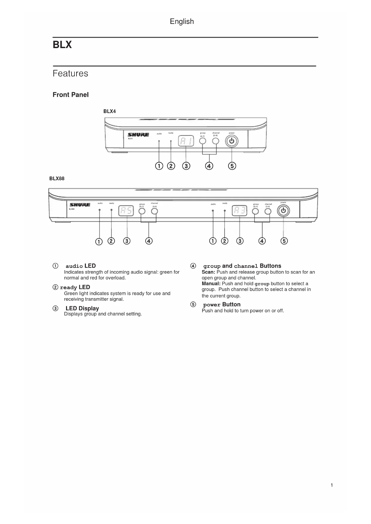 - After manual setup, the transmitter alternately displays the group and channel setting for about two seconds. Before you begin, turn off all transmitters and turn on any equipment (other microphones or personal monitoring systems) that could cause interference during the performance. group(A-Y)channelgroupgroupchannelchannelgroup group group channel English4 Multiple System Setup Up to 12 systems can operate simultaneously (band and RF environment dependent). Important: Set up each system one-at-a-time. Once a receiver and transmitter are tuned to the same group and channel, leave the transmitter powered on. Otherwise, scans from the other receivers will not detect that channel as occupied. For the BLX88, be sure to setup both transmitters before progressing to the next receiver. Turn on any other equipment that could cause interference during the performance so it will be detected during the group and channel scans in the following steps. Before you begin system set up, turn all receivers ON and all transmitters OFF. Forthefirstreceiver: