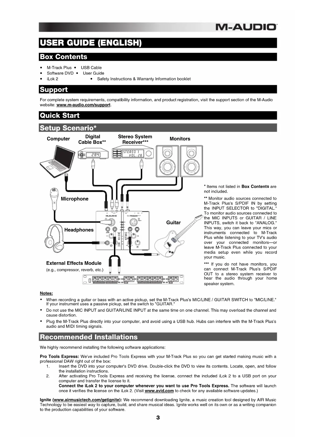 Notes: y When recording a guitar or bass with an active pickup, set the M-Track Plus's MIC/LINE / GUITAR SWITCH to "MIC/LINE." If your instrument uses a passive pickup, set the switch to "GUITAR." y Do not use the MIC INPUT and GUITAR/LINE INPUT at the same time on one channel. This may overload the channel and cause distortion. y Plug the M-Track Plus directly into your computer, and avoid using a USB hub. Hubs can interfere with the M-Track Plus's audio and MIDI timing signals. Recommended Installations We highly recommend installing the following software applications: Pro Tools Express: We've included Pro Tools Express with your M-Track Plus so you can get started making music with a professional DAW right out of the box: