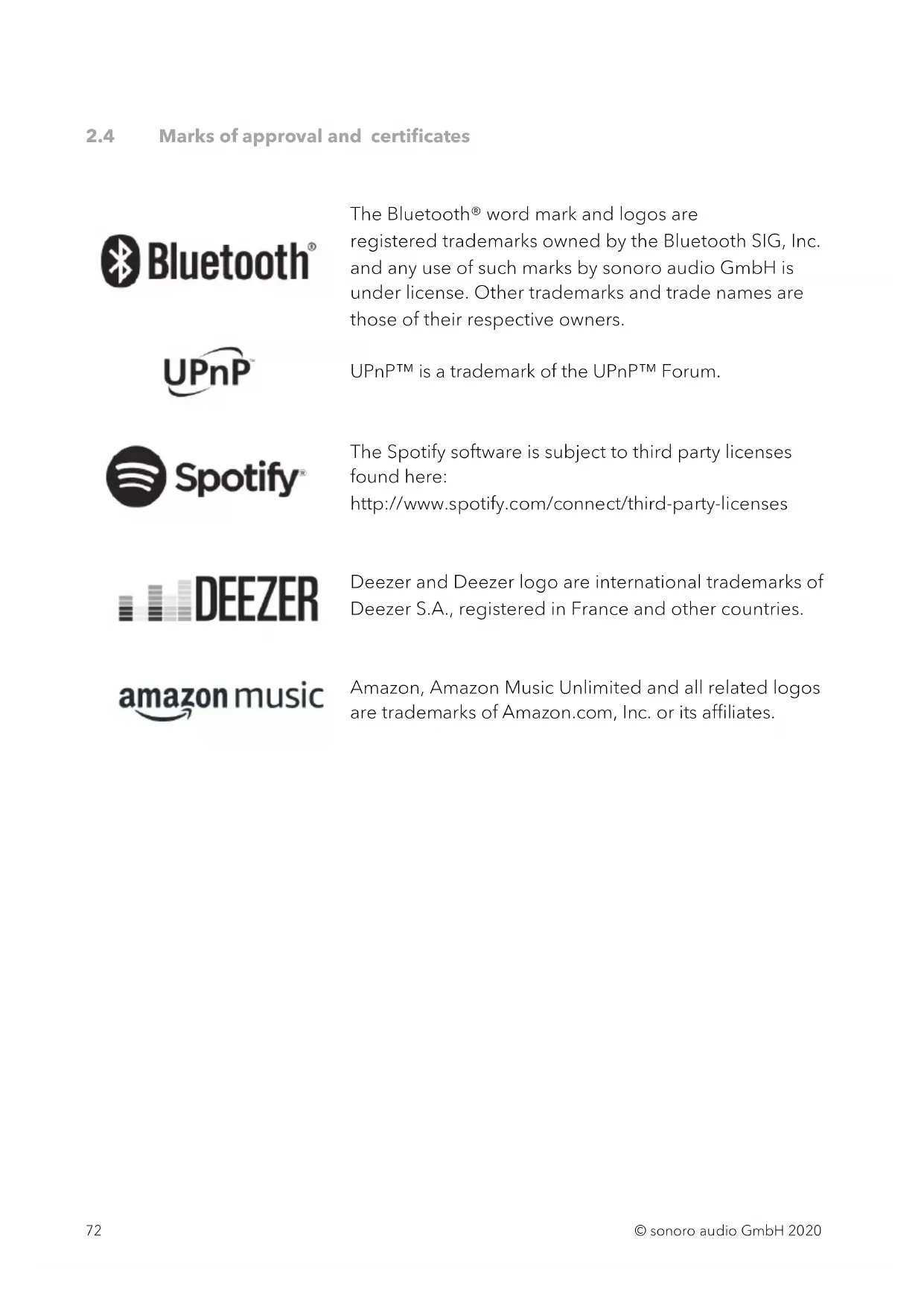 The Bluetooth® word mark and logos are registered trademarks owned by the Bluetooth SIG, Inc. and any use of such marks by sonoro audio GmbH is under license. Other trademarks and trade names are those of their respective owners. UPnP™ is a trademark of the UPnP™ Forum.