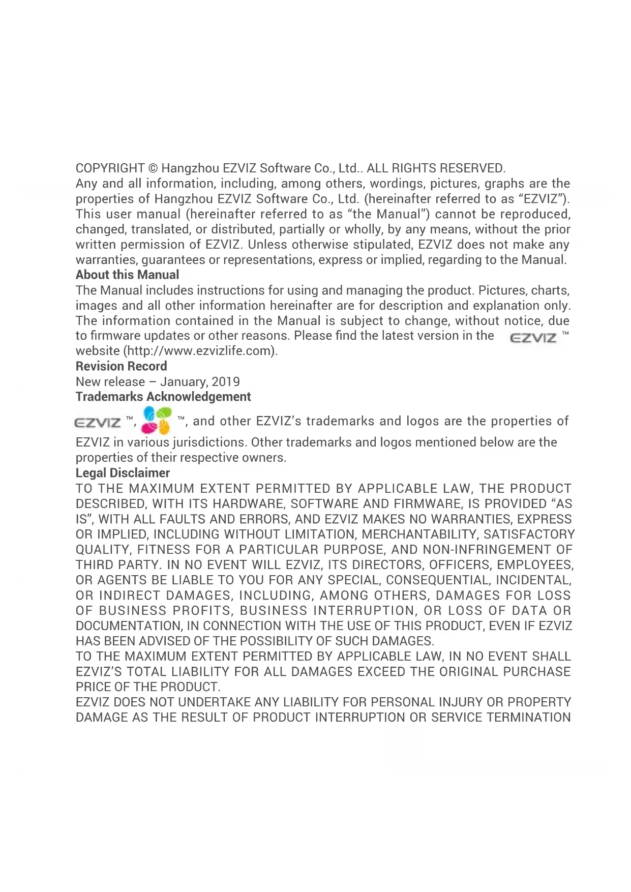 website (http://www.ezvizlife.com). Revision Record New release – January, 2019 Trademarks Acknowledgement ™, ™, and other EZVIZ’s trademarks and logos are the properties of EZVIZ in various jurisdictions. Other trademarks and logos mentioned below are the properties of their respective owners. Legal Disclaimer TO THE MAXIMUM EXTENT PERMITTED BY APPLICABLE LAW, THE PRODUCT DESCRIBED, WITH ITS HARDWARE, SOFTWARE AND FIRMWARE, IS PROVIDED “AS IS”, WITH ALL FAULTS AND ERRORS, AND EZVIZ MAKES NO WARRANTIES, EXPRESS OR IMPLIED, INCLUDING WITHOUT LIMITATION, MERCHANTABILITY, SATISFACTORY QUALITY, FITNESS FOR A PARTICULAR PURPOSE, AND NON-INFRINGEMENT OF THIRD PARTY. IN NO EVENT WILL EZVIZ, ITS DIRECTORS, OFFICERS, EMPLOYEES, OR AGENTS BE LIABLE TO YOU FOR ANY SPECIAL, CONSEQUENTIAL, INCIDENTAL, OR INDIRECT DAMAGES, INCLUDING, AMONG OTHERS, DAMAGES FOR LOSS OF BUSINESS PROFITS, BUSINESS INTERRUPTION, OR LOSS OF DATA OR DOCUMENTATION, IN CONNECTION WITH THE USE OF THIS PRODUCT, EVEN IF EZVIZ HAS BEEN ADVISED OF THE POSSIBILITY OF SUCH DAMAGES. TO THE MAXIMUM EXTENT PERMITTED BY APPLICABLE LAW, IN NO EVENT SHALL EZVIZ’S TOTAL LIABILITY FOR ALL DAMAGES EXCEED THE ORIGINAL PURCHASE PRICE OF THE PRODUCT. EZVIZ DOES NOT UNDERTAKE ANY LIABILITY FOR PERSONAL INJURY OR PROPERTY DAMAGE AS THE RESULT OF PRODUCT INTERRUPTION OR SERVICE TERMINATIONCAUSED BY: A) IMPROPER INSTALLATION OR USAGE OTHER THAN AS REQUESTED; B) THE PROTECTION OF NATIONAL OR PUBLIC INTERESTS; C) FORCE MAJEURE; D) YOURSELF OR THE THIRD PARTY, INCLUDING WITHOUT LIMITATION, USING ANY THIRD PARTY’S PRODUCTS, SOFTWARE, APPLICATIONS, AND AMONG OTHERS. REGARDING TO THE PRODUCT WITH INTERNET ACCESS, THE USE OF PRODUCT SHALL BE WHOLLY AT YOUR OWN RISKS. EZVIZ SHALL NOT TAKE ANY RESPONSIBILITES FOR ABNORMAL OPERATION, PRIVACY LEAKAGE OR OTHER DAMAGES RESULTING FROM CYBER ATTACK, HACKER ATTACK, VIRUS INSPECTION, OR OTHER INTERNET SECURITY RISKS; HOWEVER, EZVIZ WILL PROVIDE TIMELY TECHNICAL SUPPORT IF REQUIRED.SURVEILLANCE LAWS AND DATA PROTECTION LAWS VARY BY JURISDICTION. PLEASE CHECK ALL RELEVANT LAWS IN YOUR JURISDICTION BEFORE USING THIS PRODUCT IN ORDER TO ENSURE THAT YOUR USE CONFORMS TO THE APPLICABLE LAW. EZVIZ SHALL NOT BE LIABLE IN THE EVENT THAT THIS PRODUCT IS USED WITH ILLEGITIMATE PURPOSES. IN THE EVENT OF ANY CONFLICTS BETWEEN THE ABOVE AND THE APPLICABLE LAW, THE LATTER PREVAILS. Regulatory Information FCC Information This Camera complies with Part 15 of the FCC Rules. Operation is subject to the following two conditions: (1) This Camera may not cause harmful interference, and (2) This Camera must accept any interference received, including interference that may cause undesired operation. Note: This product has been tested and found to comply with the limits for a Class B digital Camera, pursuant to Part 15 of the FCC Rules. These limits are designed to provide reasonable protection against harmful interference in a residential installation. This product generates, uses, and can radiate radio frequency energy and, if not installed and used in accordance with the instructions, may cause harmful interference to radio communications. However, there is no guarantee that interference will not occur in a particular installation. If this product does cause harmful interference to radio or television reception, which can be determined by turning the equipment off and on, the user is encouraged to try to correct the interference by one or more of the following measures: —Reorient or relocate the receiving antenna. —Increase the separation between the equipment and receiver. —Connect the equipment into an outlet on a circuit different from that to which the receiver is connected.—Consult the dealer or an experienced radio/TV technician for help. Please take attention that changes or modication not expressly approved by the party responsible for compliance could void the user’s authority to operate the equipment. This equipment should be installed and operated with a minimum distance 20cm between the radiator and your body. This Camera complies with Industry Canada licence-exempt RSS standard(s). Operation is subject to the following two conditions: (1) this Camera may not cause interference, and (2) this Camera must accept any interference, including interference that may cause undesired operation of the Camera. Under Industry Canada regulations, this radio transmitter may only operate using an antenna of a type and maximum (or lesser) gain approved for the transmitter by Industry Canada. To reduce potential radio interference to other users, the antenna type and its gain should be so chosen that the equivalent isotropically radiated power (e.i.r.p.) is not more than that necessary for successful communication. EU Conformity Statement This product and - if applicable - the supplied accessories too are marked with "CE" and comply therefore with the applicable harmonized European standards listed under the Radio Equipment Directive 2014/53/EU, the EMC Directive 2014/30/EU, the RoHS Directive 2011/65/EU. 2012/19/EU (WEEE directive): Products marked with this symbol cannot be disposed of as unsorted municipal waste in the European Union. For proper recycling, return this product to your local supplier upon the purchase of equivalent new equipment, or dispose of it at designated collection points. For more information see: www.recyclethis.info. 2006/66/EC (battery directive): This product contains a battery that cannot be disposed of as unsorted municipal waste in the European Union. See the product documentation for specic battery information. The battery is marked with this symbol, which may include lettering to indicate cadmium (Cd), lead (Pb), or mercury (Hg). For proper recycling, return the battery to your supplier or to a designated collection point. For more information see: www.recyclethis.info.