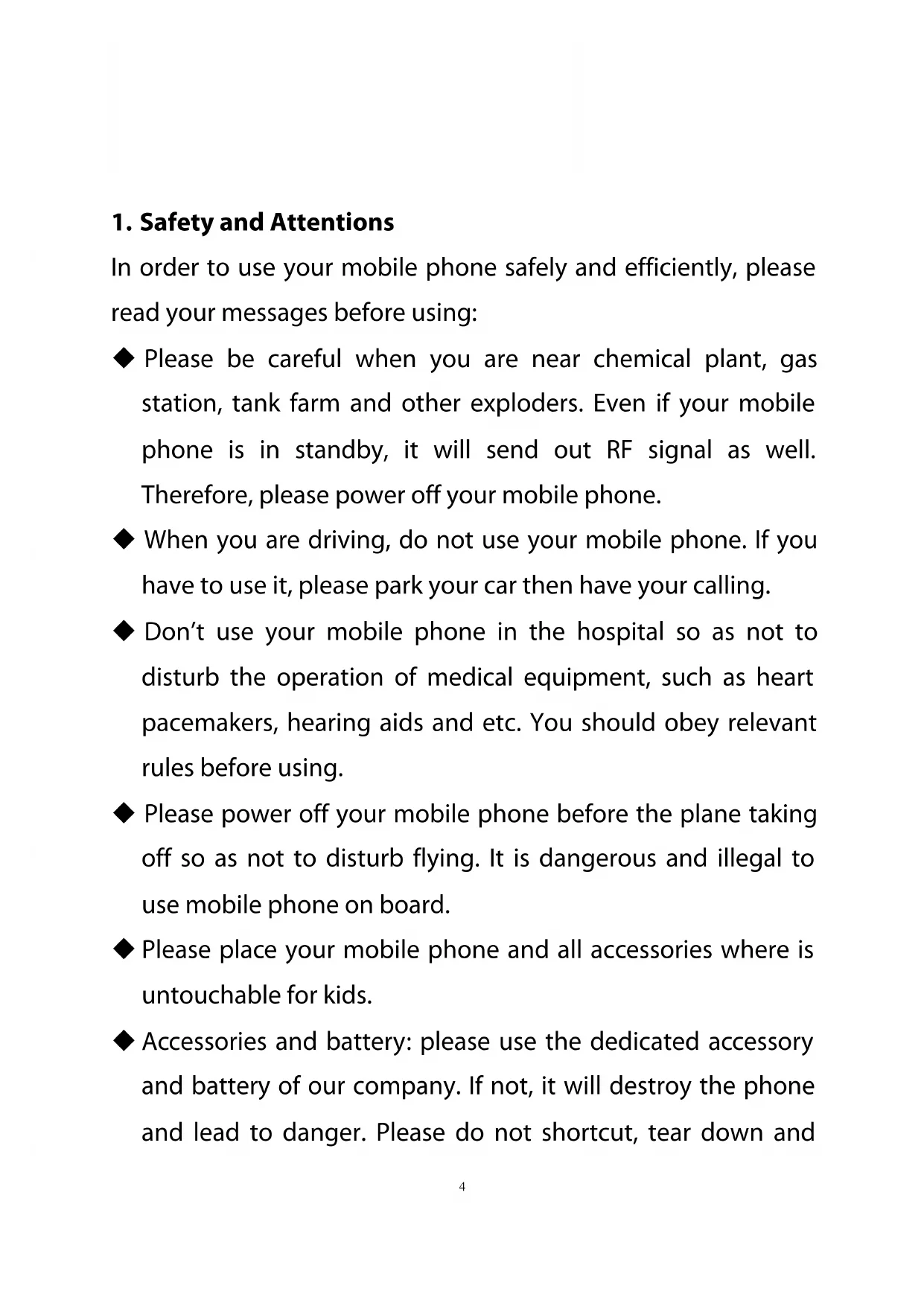 In order to use your mobile phone safely and efficiently, please read your messages before using: Please be careful when you are near chemical plant, gas station, tank farm and other exploders. Even if your mobile phone is in standby, it will send out RF signal as well. Therefore, please power off your mobile phone. When you are driving, do not use your mobile phone. If you have to use it, please park your car then have your calling. Don’t use your mobile phone in the hospital so as not to disturb the operation of medical equipment, such as heart pacemakers, hearing aids and etc. You should obey relevant rules before using. Please power off your mobile phone before the plane taking off so as not to disturb flying. It is dangerous and illegal to use mobile phone on board. Please place your mobile phone and all accessories where is untouchable for kids. Accessories and battery: please use the dedicated accessory and battery of our company. If not, it will destroy the phone and lead to danger. Please do not shortcut, tear down and5 adapt the battery. If the phone has excessive temperature, discolor, variant, bulking, weeping and other unusual phenomenon, please stop using and change the battery immediately so as not to affect the safety. Please place the old batteries in specific recycle spots. No charging without the battery. When you take off the battery, please power off the mobile phone so as not destroy the property of the phone. The phone is not waterproof. Please keep it dry. Avoid using the phone in an excessive and too low temperature. Not throw, fall and beat the phone so as not to destroy the internal and external phone. Authorized Service: install and maintain the phone by professional people. Please not tear off the phone on your own. The counting unit of radiation standard is called SAR. In the international norm, the SAR limitation is 2.0 W/Kg. The maximal SAR of this phone is 0.482 W/Kg. It meets the state criterion of GB 21288-2007.6
