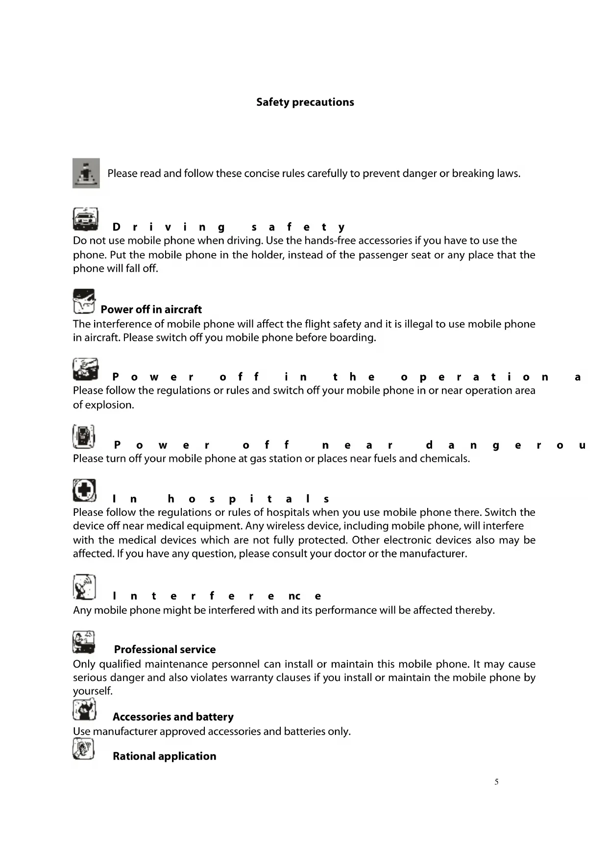 Driving safety Do not use mobile phone when driving. Use the hands-free accessories if you have to use the phone. Put the mobile phone in the holder, instead of the passenger seat or any place that the phone will fall off. Power off in aircraft The interference of mobile phone will affect the flight safety and it is illegal to use mobile phone in aircraft. Please switch off you mobile phone before boarding. Power off in the operation area of explosion Please follow the regulations or rules and switch off your mobile phone in or near operation area of explosion. Power off near dangerous articles Please turn off your mobile phone at gas station or places near fuels and chemicals. In hospitals Please follow the regulations or rules of hospitals when you use mobile phone there. Switch the device off near medical equipment. Any wireless device, including mobile phone, will interfere with the medical devices which are not fully protected. Other electronic devices also may be affected. If you have any question, please consult your doctor or the manufacturer. Interference Any mobile phone might be interfered with and its performance will be affected thereby. Professional service Only qualified maintenance personnel can install or maintain this mobile phone. It may cause serious danger and also violates warranty clauses if you install or maintain the mobile phone by yourself. Accessories and battery Use manufacturer approved accessories and batteries only. Rational application6 Use the mobile phone in normal way. Do not put your mobile phone in the environment with too high temperature (higher than 60ć), for example, put it under the window which is irradiated by sunshine directly. Please use wet or antistatic cloth to clean your phone. Do not use the cloth with static to wipe the phone. Emergency call Make sure that the mobile phone is switched on and in service area, enter the emergency number (e.g. 110) and press the Call key to call the number. Report your position and explain your condition briefly. Do not end the call without permission.