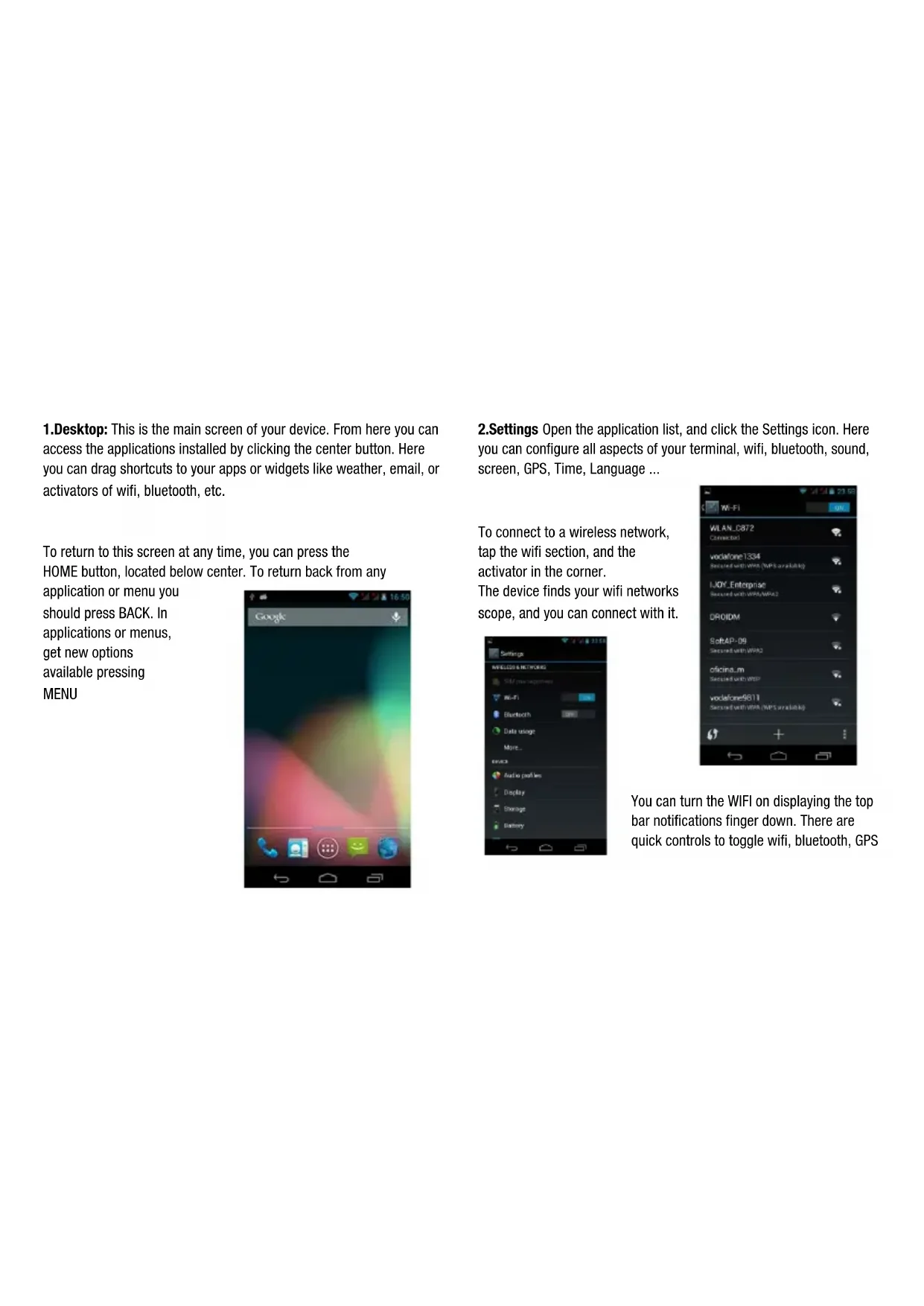 2.Settings Open the application list, and click the Settings icon. Here you can configure all aspects of your terminal, wifi, bluetooth, sound, screen, GPS, Time, Language ... To connect to a wireless network, tap the wifi section, and the activator in the corner. The device finds your wifi networks scope, and you can connect with it.