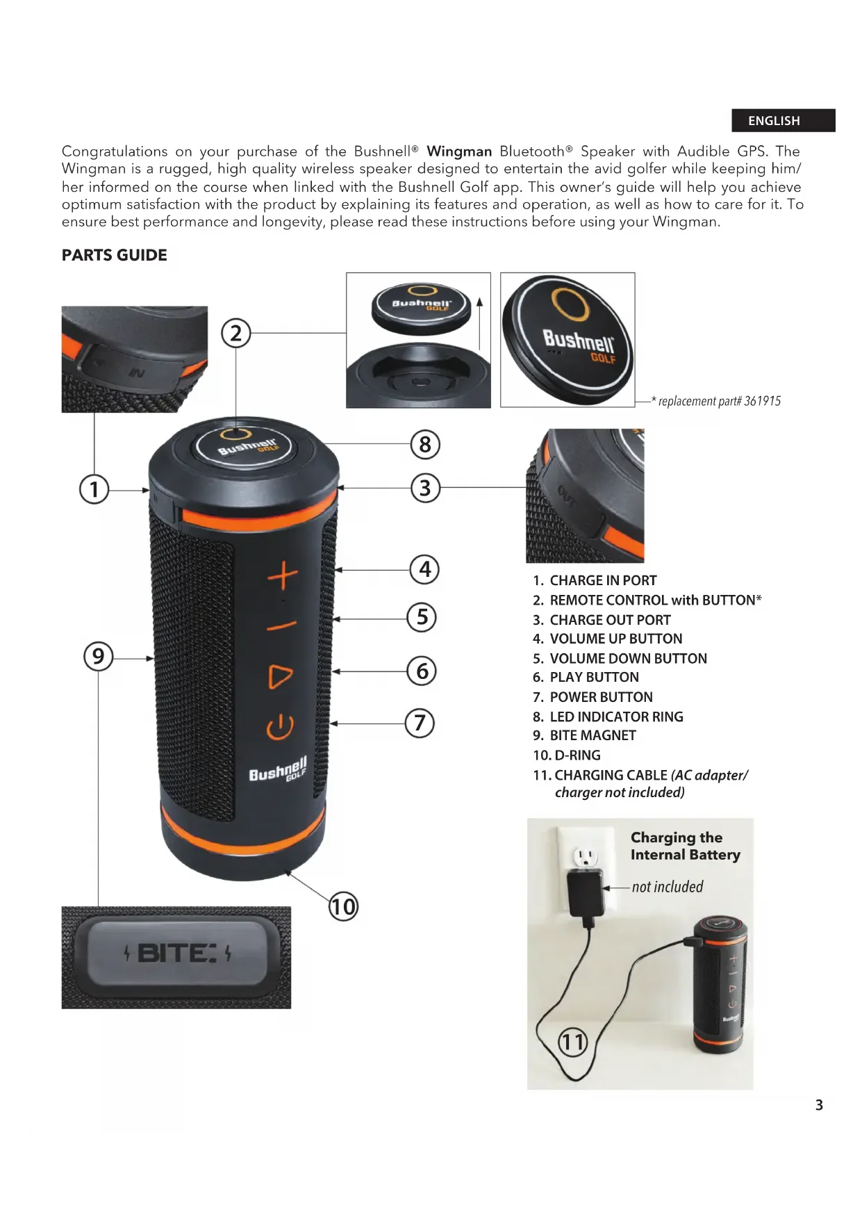 Congratulations on your purchase of the Bushnell® Wingman Bluetooth® Speaker with Audible GPS. The Wingman is a rugged, high quality wireless speaker designed to entertain the avid golfer while keeping him/ her informed on the course when linked with the Bushnell Golf app. This owner’s guide will help you achieve optimum satisfaction with the product by explaining its features and operation, as well as how to care for it. To ensure best performance and longevity, please read these instructions before using your Wingman. ENGLISH