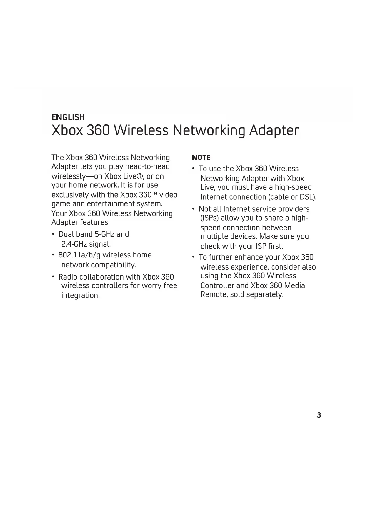 - To further enhance your Xbox 360 wireless experience, consider also using the Xbox 360 Wireless Controller and Xbox 360 Media Remote, sold separately. ENGLISH Xbox 360 Wireless Networking Adapter X112996102_man.indd 3 1/19/2006 11:54:33 AM4 english
