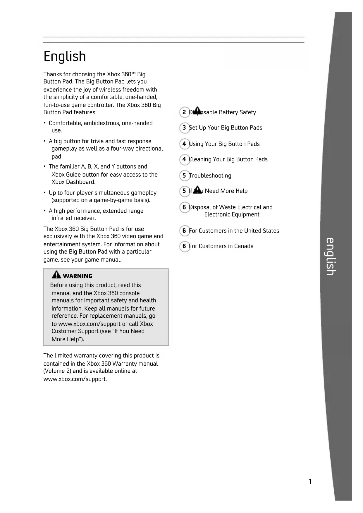 - A high performance, extended range infrared receiver. The Xbox 360 Big Button Pad is for use exclusively with the Xbox 360 video game and entertainment system. For information about using the Big Button Pad with a particular game, see your game manual. The limited warranty covering this product is contained in the Xbox 360 Warranty manual (Volume 2) and is available online at www.xbox.com/support. warning Before using this product, read this manual and the Xbox 360 console manuals for important safety and health information. Keep all manuals for future reference. For replacement manuals, go to www.xbox.com/support or call Xbox Customer Support (see “If You Need More Help”). warning Before using this product, read this manual and the Xbox 360 console manuals for important safety and health information. Keep all manuals for future reference. For replacement manuals, go to www.xbox.com/support or call Xbox Customer Support (see “If You Need More Help”). 2 Disposable Battery Safety 3 Set Up Your Big Button Pads 4 Using Your Big Button Pads 4 Cleaning Your Big Button Pads 5 Troubleshooting 5 If You Need More Help 6 Disposal of Waste Electrical and Electronic Equipment 6 For Customers in the United States 6 For Customers in Canadaenglish