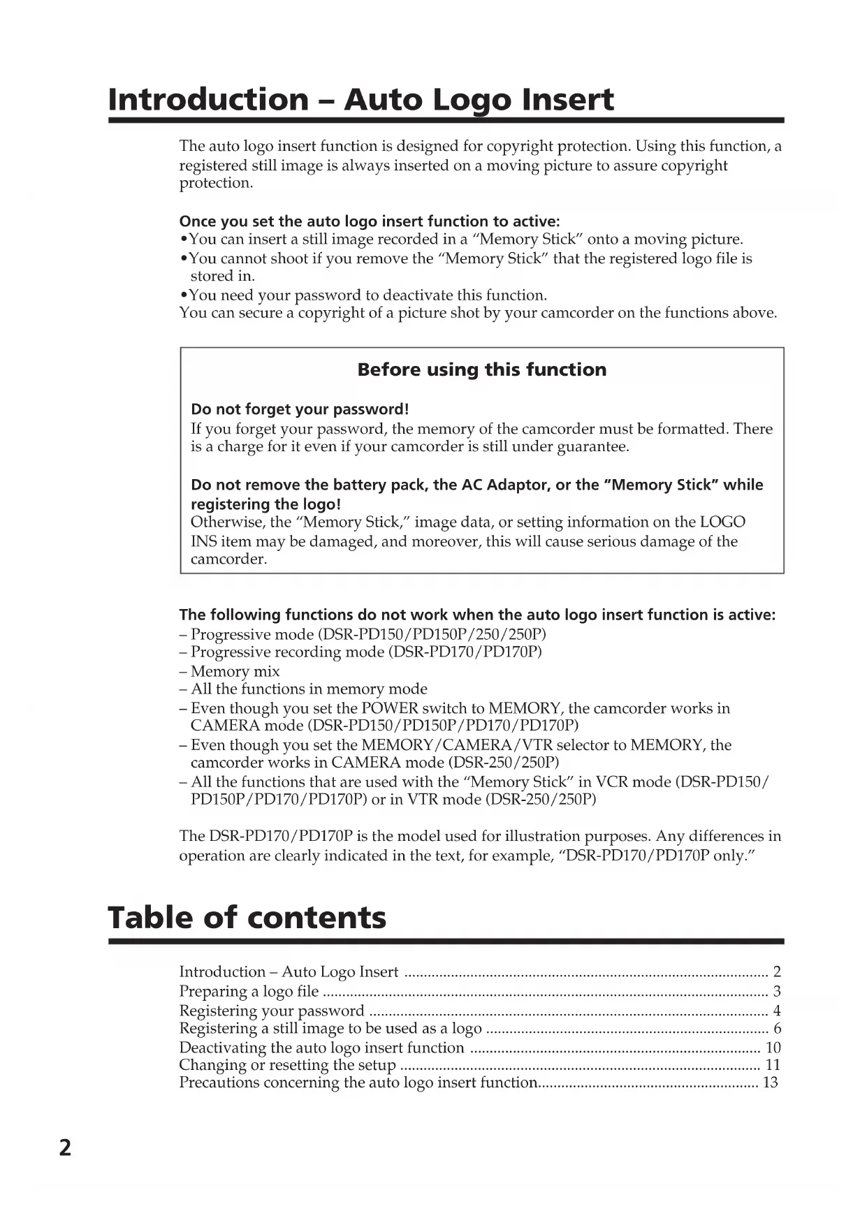 - You need your password to deactivate this function. You can secure a copyright of a picture shot by your camcorder on the functions above. Before using this function Do not forget your password! If you forget your password, the memory of the camcorder must be formatted. There is a charge for it even if your camcorder is still under guarantee. Do not remove the battery pack, the AC Adaptor, or the “Memory Stick” while registering the logo! Otherwise, the “Memory Stick,” image data, or setting information on the LOGO INS item may be damaged, and moreover, this will cause serious damage of the camcorder. The following functions do not work when the auto logo insert function is active: – Progressive mode (DSR-PD150/PD150P/250/250P) – Progressive recording mode (DSR-PD170/PD170P) – Memory mix – All the functions in memory mode – Even though you set the POWER switch to MEMORY, the camcorder works in CAMERA mode (DSR-PD150/PD150P/PD170/PD170P) – Even though you set the MEMORY/CAMERA/VTR selector to MEMORY, the camcorder works in CAMERA mode (DSR-250/250P) – All the functions that are used with the “Memory Stick” in VCR mode (DSR-PD150/ PD150P/PD170/PD170P) or in VTR mode (DSR-250/250P) The DSR-PD170/PD170P is the model used for illustration purposes. Any differences in operation are clearly indicated in the text, for example, “DSR-PD170/PD170P only.” Table of contents Introduction – Auto Logo Insert .............................................................................................. 2 Preparing a logo file ................................................................................................................... 3 Registering your password .......................................................................................................4 Registering a still image to be used as a logo ......................................................................... 6 Deactivating the auto logo insert function ........................................................................... 10 Changing or resetting the setup ............................................................................................. 11 Precautions concerning the auto logo insert function......................................................... 133 Preparing a logo file To insert a logo file on a moving picture, there are two ways: one uses the luminancekey setting and the other uses the chroma setting. Preparation 1 Creating a logo file Create a logo file at 640 × 480 dots (VGA size). Luminancekey (LUMINANCE) Makes a brighter portion of a still image transparent, then records a moving picture on that portion. When you use luminancekey to insert a logo file, the background (transparent portion) of the logo file must be created in white, and the ratio setting of the RGB signal must be as follows: R=255, G=255, and B=255. If an image has a brighter portion other than the background, that portion may be transparent. Chroma (CHROMA) Makes a blue portion of a still image transparent, then records a moving picture on that portion. When you use chroma to insert a logo file, the background (transparent portion) of the logo file must be created in blue, and the ratio setting of an RGB signal must be as follows: R=0, G=0, and B=255. If an image has a blue portion other than the background, that portion may be made transparent. Preparation 2 Saving a logo file in the “Memory Stick” format Convert a logo file format to the “Memory Stick” format, and save it in the 100msdcf folder, using the supplied application, PictureGear. (For DSR-PD170/PD170P models, PictureGear is optional.) Notes