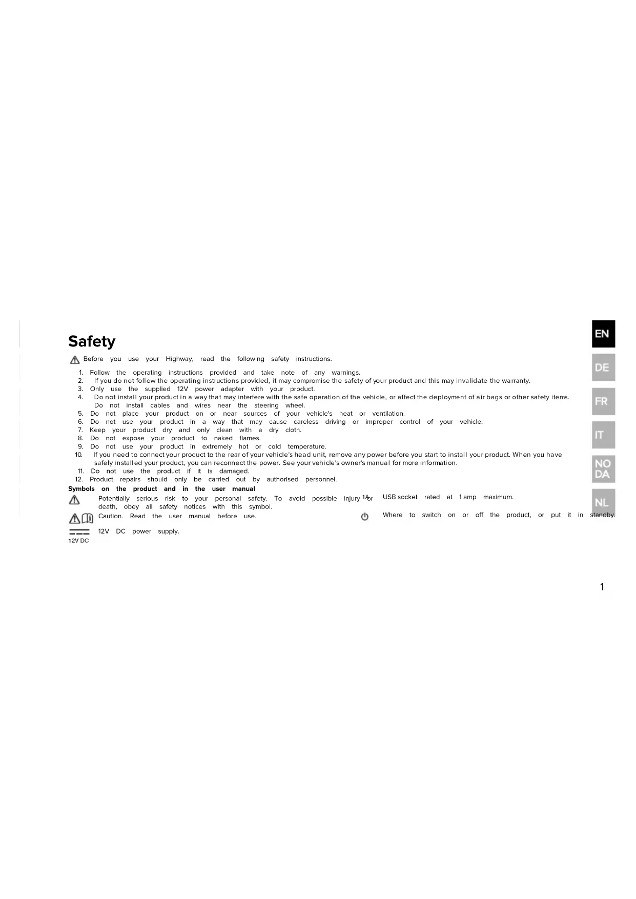 USBsocket rated at 1amp maximum. Caution. Read the user manual before use. Where to switch on or off the product, or put it in standby. 12V DC 12V DC power supply.