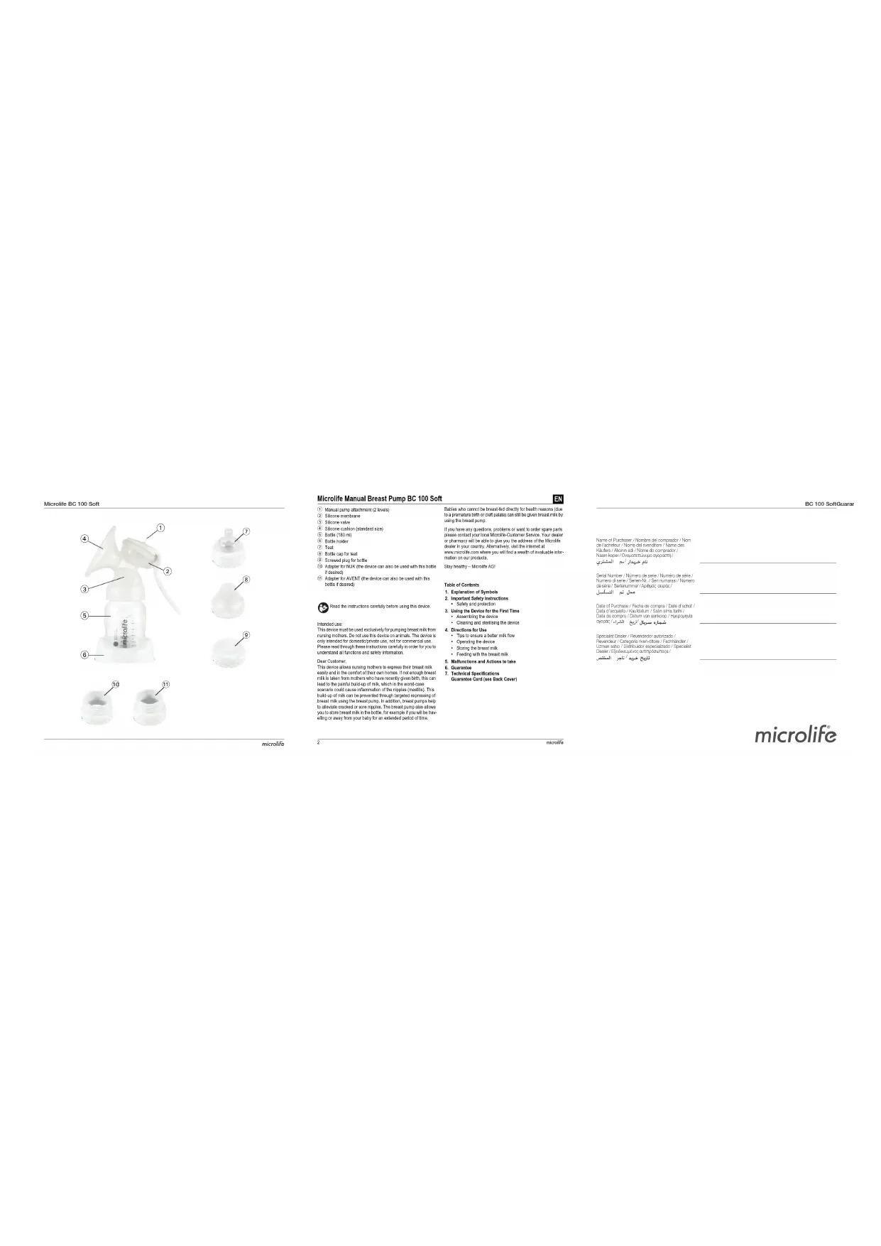 Read the instructions carefully before using this device. Intended use: This device must be used exclusively for pumping breast milk from nursing mothers. Do not use this device on animals. The device is only intended for domestic/private use, not for commercial use. Please read through these instructions carefully in order for you to understand all functions and safety information. Dear Customer, This device allows nursing mothers to express their breast milk easily and in the comfort of their own homes. If not enough breast milk is taken from mothers who have recently given birth, this can lead to the painful build-up of milk, which in the worst-case scenario could cause inflammation of the nipples (mastitis). This build-up of milk can be prevented through targeted expressing of breast milk using the breast pump. In addition, breast pumps help to alleviate cracked or sore nipples. The breast pump also allows you to store breast milk in the bottle, for example if you will be trav- elling or away from your baby for an extended period of time. Babies who cannot be breast-fed directly for health reasons (due to a premature birth or cleft palate) can still be given breast milk by using the breast pump. If you have any questions, problems or want to order spare parts please contact your local Microlife-Customer Service. Your dealer or pharmacy will be able to give you the address of the Microlife dealer in your country. Alternatively, visit the internet at www.microlife.com where you will find a wealth of invaluable infor- mation on our products. Stay healthy – Microlife AG! Table of Contents
