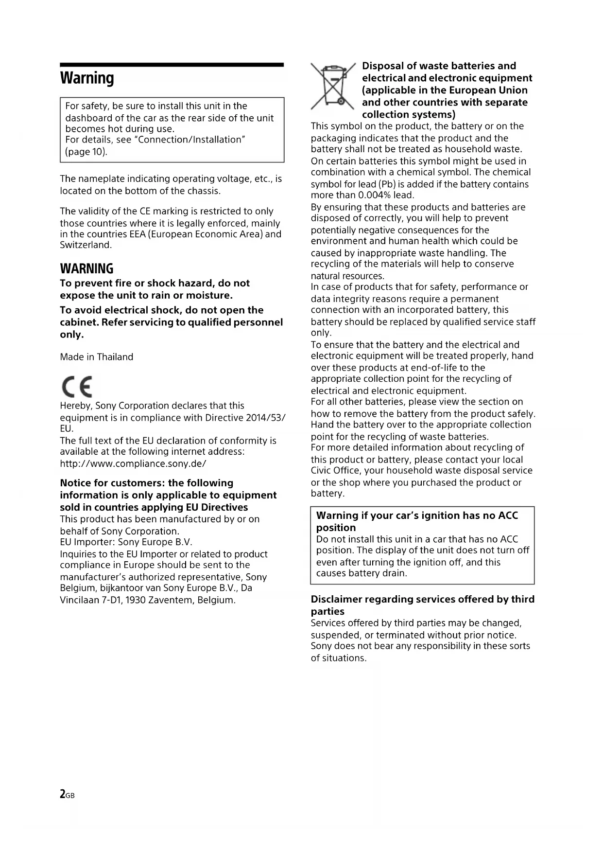 /4 in) (w/h/d) Mass: Approx. 0.9 kg (1 lb 16 oz) Package contents: Main unit (1) Parts for installation and connections (1 set) Ask the dealer for detailed information. Design and specifications are subject to change without notice. The Bluetooth® word mark and logos are registered trademarks owned by the Bluetooth SIG, Inc. and any use of such marks by Sony Corporation is under license. Other trademarks and trade names are those of their respective owners. Windows Media is either a registered trademark or trademark of Microsoft Corporation in the United States and/or other countries. This product is protected by certain intellectual property rights of Microsoft Corporation. Use or distribution of such technology outside of this product is prohibited without a license from Microsoft or an authorized Microsoft subsidiary. Apple and iPhone are trademarks of Apple Inc., registered in the U.S. and other countries. WebLink is a registered trademark of Abalta Technologies, Inc. in the U.S. and a trademark in the other countries. All other trademarks are trademarks of their respective owners. Copyrights10GB Cautions