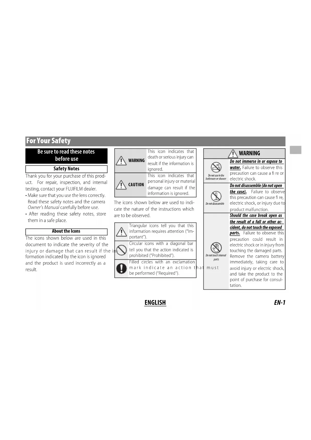- After reading these safety notes, store them in a safe place. About the Icons The icons shown below are used in this document to indicate the severity of the injury or damage that can result if the in- formation indicated by the icon is ignored and the product is used incorrectly as a result. WARNINGThis icon indicates that death or serious injury can result if the information is ignored.CAUTIONThis icon indicates that personal injury or material damage can result if the information is ignored. The icons shown below are used to indi- cate the nature of the instructions which are to be observed. Triangular icons tell you that this information requires attention (“Im-portant”).Circular icons with a diagonal bar tell you that the action indicated is prohibited (“Prohibited”).Filled circles with an exclamation mark indicate an action that must be performed (“Required”). WARNING WARNING Do not use in the bathroom or showerDo not immerse in or expose to water. Failure to observe this precaution can cause a fi re or electric shock.Do not disassembleDo not disassemble (do not open the case). Failure to observe this precaution can cause fi re, electric shock, or injury due to product malfunction.Do not touch internal partsShould the case break open as the result of a fall or other ac-cident, do not touch the exposed parts. Failure to observe this precaution could result in electric shock or in injury from touching the damaged parts. Remove the camera battery immediately, taking care to avoid injury or electric shock, and take the product to the point of purchase for consul-tation.EN-2 ENGLISH WARNING WARNING Do not place on unstable sur- faces. The product may fall, causing injury. Do not view the sun through the lens or camera view nders. Failure to observe this precau- tion can cause permanent visual impairment. CAUTION CAUTION Do not use or store in locations that are exposed to steam, or smoke or are very humid or extremely dusty. Failure to observe this precaution can cause fi re or electric shock. Do not leave in direct sunlight or in locations subject to very high temperatures, such as in a closed vehicle on a sunny day. Failure to observe this precau- tion can cause fi re. CAUTION CAUTION Keep out of the reach of small children. This product could cause injury in the hands of a child. Do not handle with wet hands. Failure to observe this precau- tion can cause electric shock. Keep the sun out of the frame when shooting backlit subjects. Sunlight focused into the camera when the sun is in or close to the frame can cause fi r e o r b u r n s . When the product is not in use, replace the lens caps and store out of direct sunlight. Sunlight focused by the lens can cause fi r e o r b u r n s . Do not carry the camera or lens while they are attached to a tripod. The product can fall or strike other objects, caus- ing injury. For Customers in the U. S. A. For Customers in the U. S. A. Tested To Comply With FCC Standards