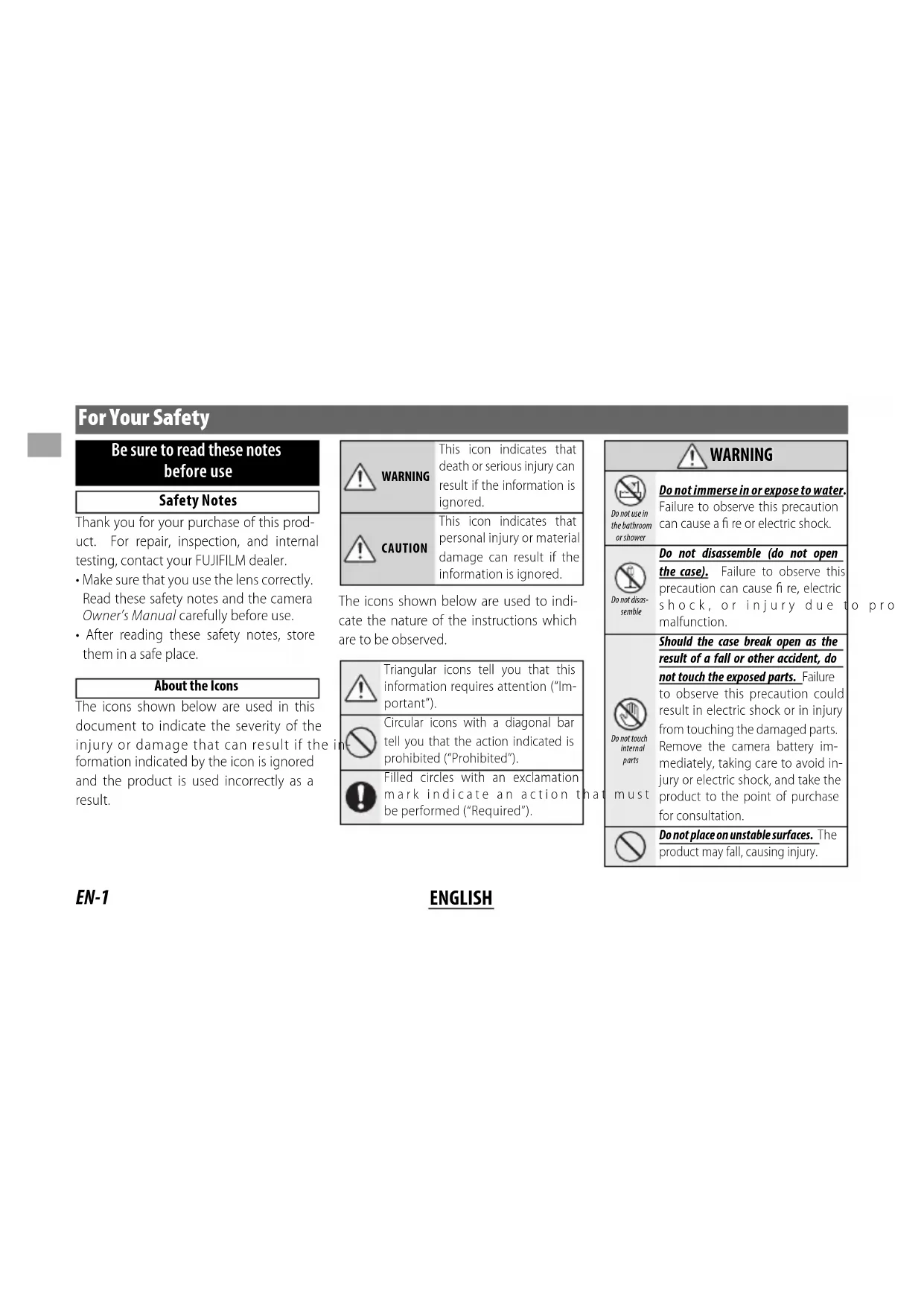 - After reading these safety notes, store them in a safe place. About the Icons The icons shown below are used in this document to indicate the severity of the injury or damage that can result if the in- formation indicated by the icon is ignored and the product is used incorrectly as a result. WARNINGThis icon indicates that death or serious injury can result if the information is ignored.CAUTIONThis icon indicates that personal injury or material damage can result if the information is ignored. The icons shown below are used to indi- cate the nature of the instructions which are to be observed. Triangular icons tell you that this information requires attention (“Im-portant”).Circular icons with a diagonal bar tell you that the action indicated is prohibited (“Prohibited”).Filled circles with an exclamation mark indicate an action that must be performed (“Required”). WARNING WARNING Do not use in the bathroom or showerDo not immerse in or expose to water. Failure to observe this precaution can cause a fi re or electric shock.Do not disas-sembleDo not disassemble (do not open the case). Failure to observe this precaution can cause fi re, electric shock, or injury due to product malfunction.Do not touch internal partsShould the case break open as the result of a fall or other accident, do not touch the exposed parts. Failure to observe this precaution could result in electric shock or in injury from touching the damaged parts. Remove the camera battery im-mediately, taking care to avoid in-jury or electric shock, and take the product to the point of purchase for consultation.Do not place on unstable surfaces. The product may fall, causing injury.EN-2 ENGLISH WARNING WARNING Do not view the sun through the lens or camera view nders. Failure to observe this precaution can cause permanent visual impairment. CAUTION CAUTION Do not use or store in locations that are exposed to steam, or smoke or are very humid or extremely dusty. Fail- ure to observe this precaution can cause fi re or electric shock. Do not leave in direct sunlight or in locations subject to very high tem- peratures, such as in a closed vehicle on a sunny day. Failure to observe this precaution can cause fi re. Keep out of the reach of small chil- dren. This product could cause injury in the hands of a child. Do not handle with wet hands. Fail- ure to observe this precaution can cause electric shock. CAUTION CAUTION Keep the sun out of the frame when shooting backlit subjects. Sunlight focused into the camera when the sun is in or close to the frame can cause fi re or burns. When the product is not in use, re- place the lens caps and store out of direct sunlight. Sunlight focused by the lens can cause fi re or burns. Do not carry the camera or lens while they are attached to a tripod. The product can fall or strike other ob- jects, causing injury. Do not rapidly rotate the camera while holding the grip. Your hand could strike the tripod or tripod collar foot, causing injury. Before handling the camera, fully tighten or loosen the tripod collar lock screw according to whether the camera will be used in a xed orientation or rotated. If the screw is only partially tightened, the camera may move unexpectedly, causing injury. For Customers in the U. S. A. For Customers in the U. S. A. Tested To Comply With FCC Standards