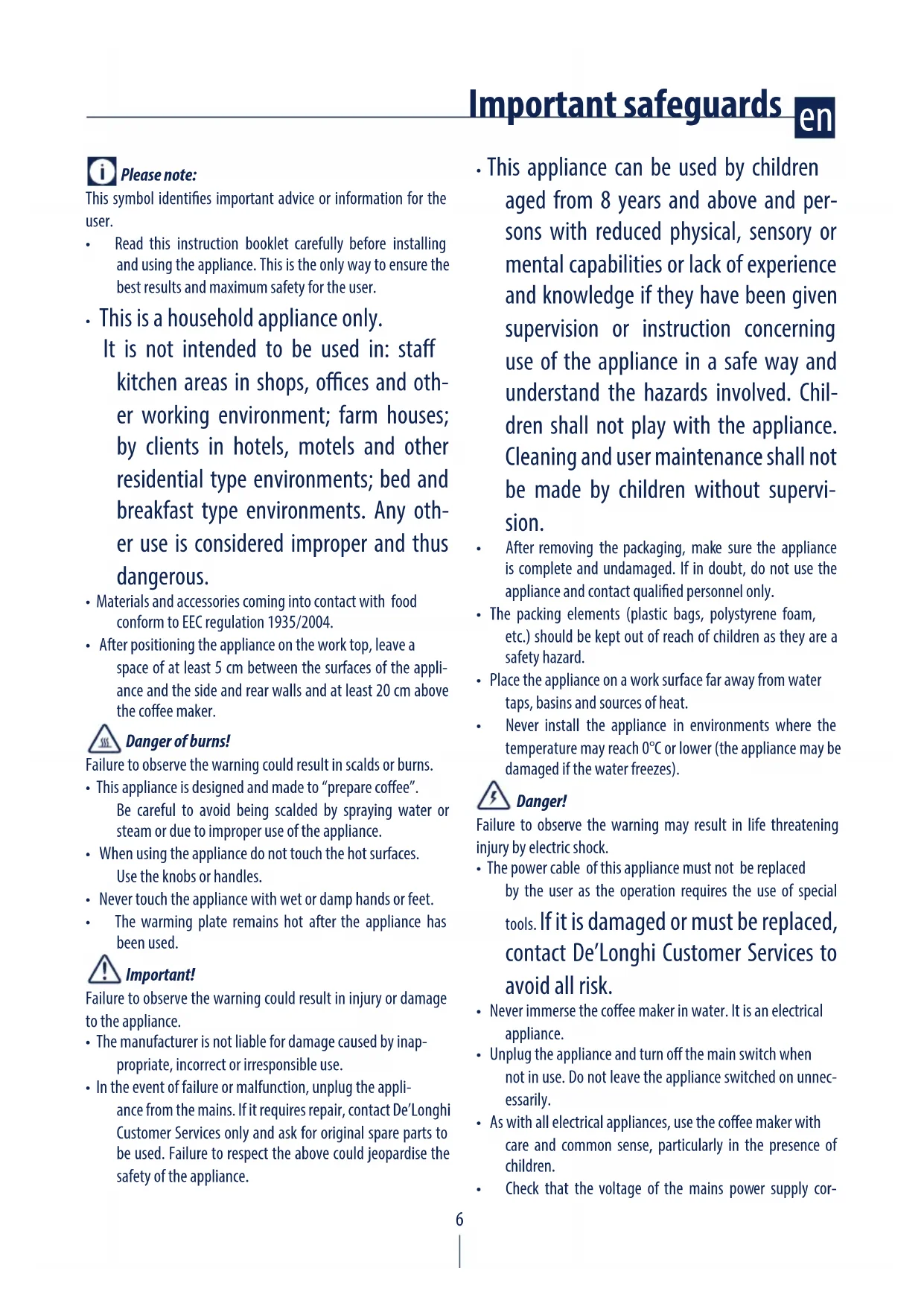 - The power cable of this appliance must not be replaced by the user as the operation requires the use of special tools. If it is damaged or must be replaced, contact De’Longhi Customer Services to avoid all risk.