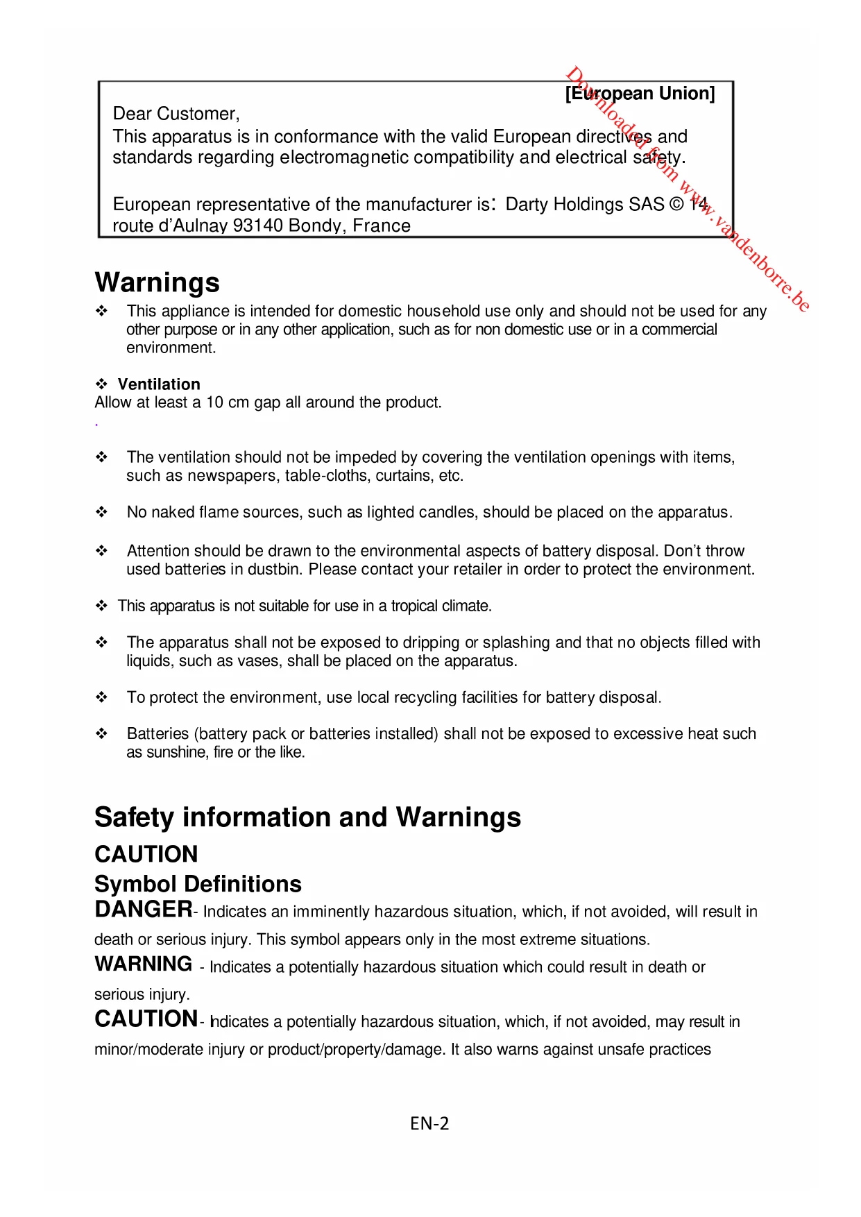 ARNING - Indicates a potentially hazardous situation which could result in death or serious injury. CAUTION - Indicates a potentially hazardous situation, which, if not avoided, may result in minor/moderate injury or product/property/damage. It also warns against unsafe practices [European Union] Dear Customer, This apparatus is in conformance with the valid European directives and standards regarding electromagnetic compatibility and electrical safety. European representative of the manufacturer is: Darty Holdings SAS © 14 route d’Aulnay 93140 Bondy, France Downloaded from www.vandenborre.beEN-3 The lightning flash with arrowhead symbol, within an equilateral triangle is intended to alert the user to the presence of insulated ‘dangerous voltage’ within the product’s enclosure that may be of sufficient magnitude to constitute a risk of electric shock to persons.
