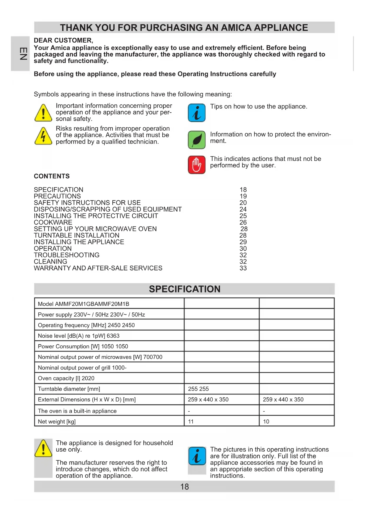 The pictures in this operating instructions are for illustration only. Full list of the appliance accessories may be found in an appropriate section of this operating instructions. Model AMMF20M1GB AMMF20M1BPower supply 230V~ / 50Hz 230V~ / 50HzOperating frequency [MHz] 2450 2450Noise level [dB(A) re 1pW] 63 63Power Consumption [W] 1050 1050Nominal output power of microwaves [W] 700 700Nominal output power of grill 1000 -Oven capacity [l] 20 20Turntable diameter [mm] 255 255 External Dimensions (H x W x D) [mm] 259 x 440 x 350 259 x 440 x 350 The oven is a built-in appliance - - Net weight [kg] 11 10 SPECIFICATION CONTENTS SPECIFICATION 18 PRECAUTIONS 19