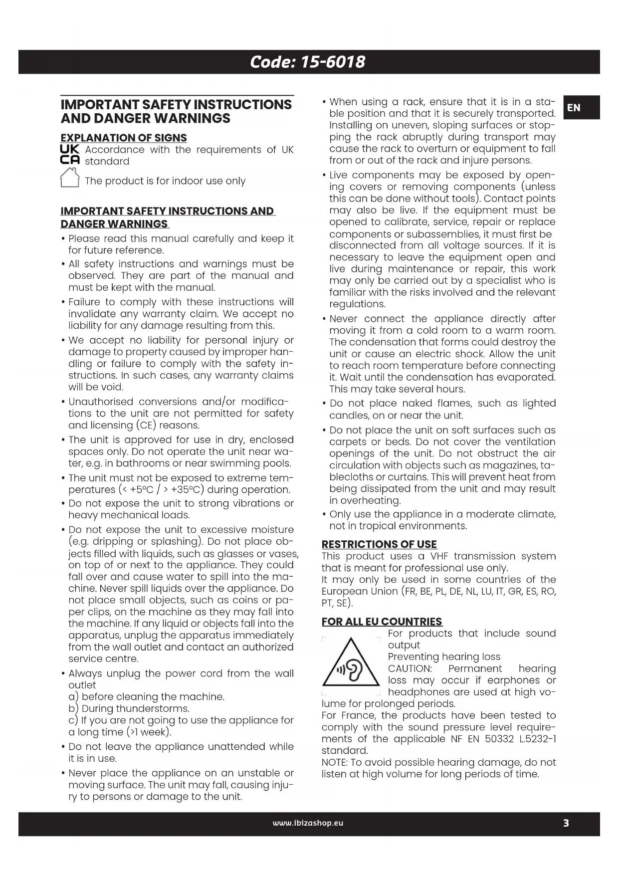 This product uses a VHF transmission system that is meant for professional use only. It may only be used in some countries of the European Union (FR, BE, PL, DE, NL, LU, IT, GR, ES, RO, PT, SE).