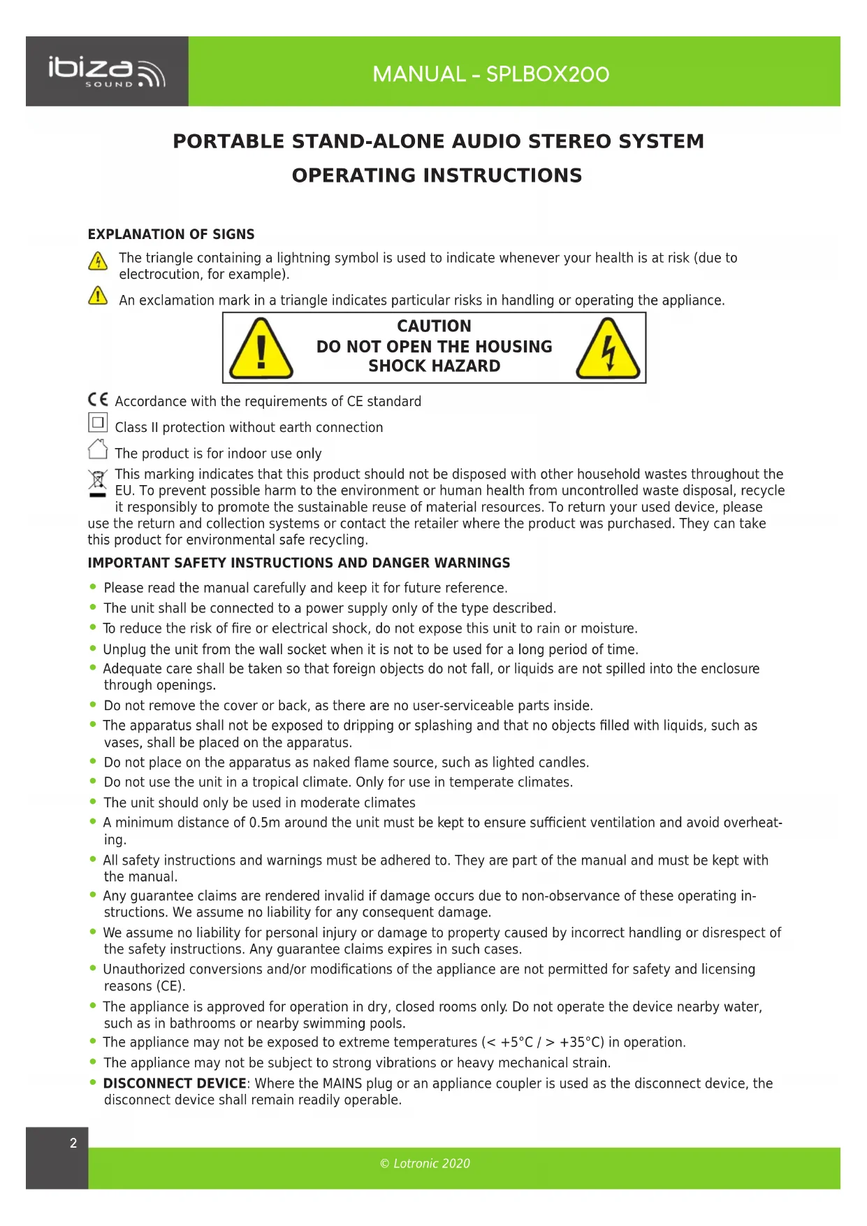 Responsable technique©Copyright LOTRONIC 2020 View the products on our website Any problem or question? Contact us on facebook SPLBOX200 Imported from China by LOTRONIC S.A. Avenue Zénobe Gramme 9 B-1480 Saintes www.ibiza-light.com