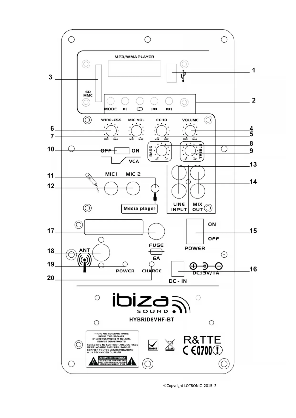 - If you are not sure about the correct connection or if questions arise which are not answered by the operating instructions, please do not hesitate to contact support or a specialist of your choice. Consult a specialist if you are in doubt the operating principle or the safety of the product. Disconnection from the mains GB©Copyright LOTRONIC 2015 4 Where the MAINS plug or an appliance couples is used as the disconnect device, the disconnect device shall remain readily accessible. If a switch is used to disconnect the device, the switch and its function must be clearly identified and remain easily accessible. Restrictions of Use - As the product contains a transmission/reception system of VHF signals, it is exclusively meant for professional use. The user of the product is fully responsible for the use he makes of the product. The distributor cannot be held responsible for an eventual misuse by the user of the product. - The symbol “!” that appears on the wireless transmitter, the packaging, the manual and on the product means that the product is allowed for use only in some countries of the European Community (FR – BE – PT – D – NL – LU – GR – SP – RO). FEATURES BLUETOOTH Built-in amp Built-in USB MP3 / WMA player Built in VHF microphone receiver Remote Control Treble & Bass control Mic VOL & ECHO controls Master VOL control MIC & LINE inputs Built-in rechargeable battery Rectractable trolley & wheels (only model HYBRID10VHF-BT) Power source: 13Vdc, 1A via supplied mains adaptor
