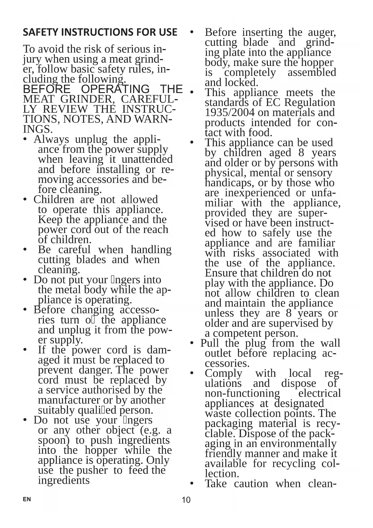 - Before removing the grind- ing attachment, make sure the meat grinder is turned o. Ensure the appliance is correctly assembled before connecting it to the power socket.