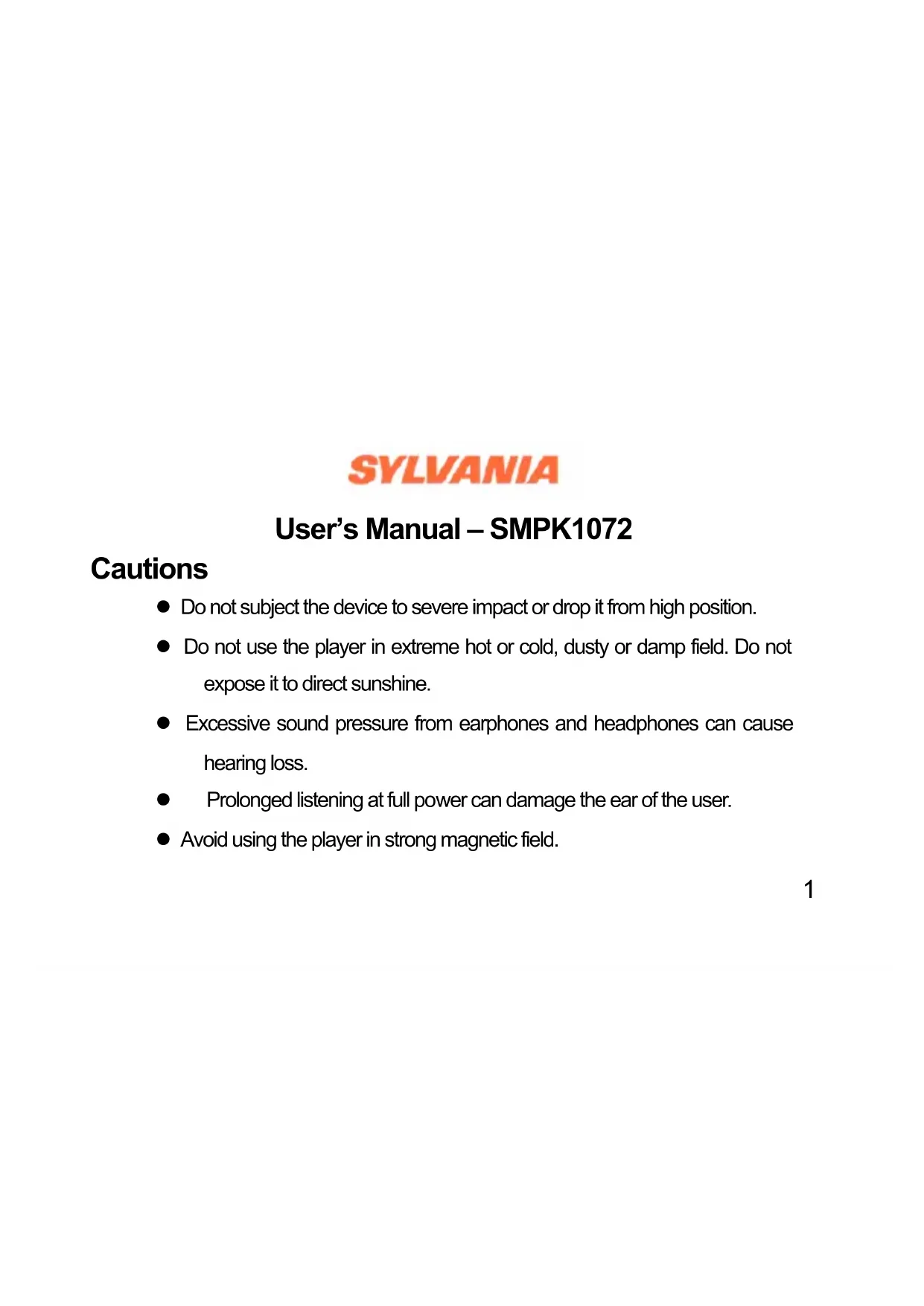 Download the instructions for your Mp3 player in PDF format for free! Find your manual SMPK1072 - SYLVANIA and take your electronic device back in hand. On this page are published all the documents necessary for the use of your device. SMPK1072 by SYLVANIA.