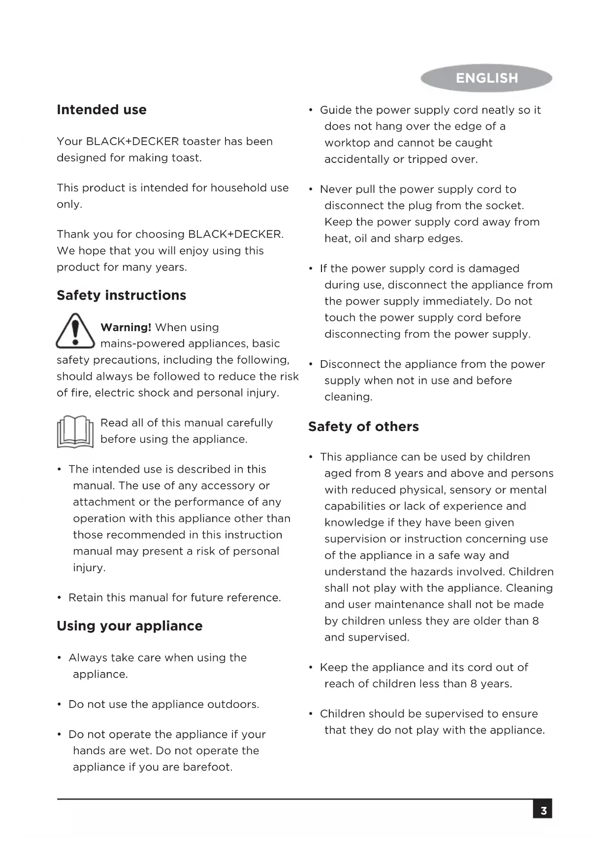 www.blackanddecker.ae BFET200 AR PT FR EN2 ENGLISH3 ENGLISH Intended use Your BLACK+DECKER toaster has been designed for making toast. This product is intended for household use only. Thank you for choosing BLACK+DECKER. We hope that you will enjoy using this product for many years. Safety instructions Warning! When using mains-powered appliances, basic safety precautions, including the following, should always be followed to reduce the risk of fire, electric shock and personal injury. Read all of this manual carefully before using the appliance.