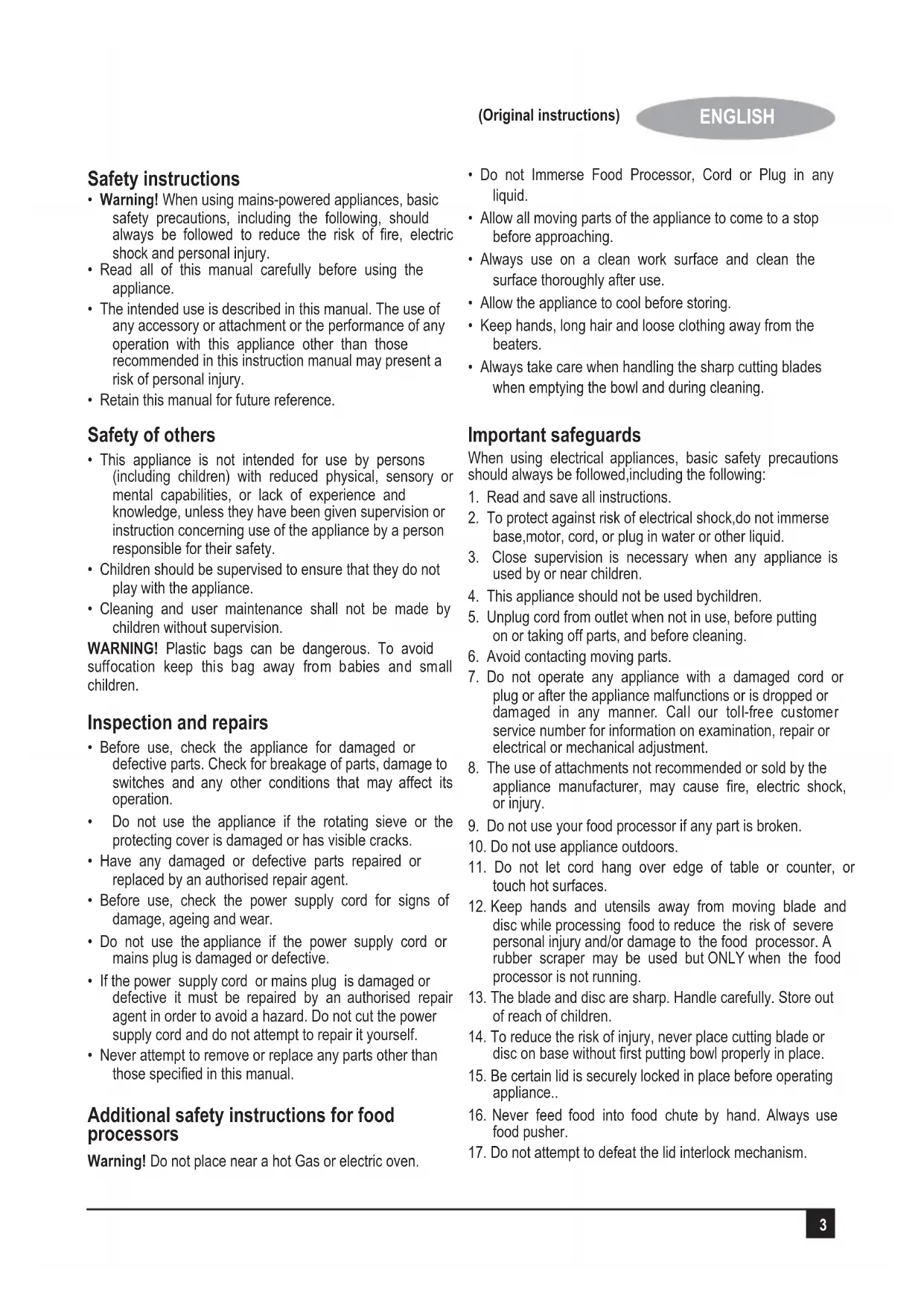 - Never attempt to remove or replace any parts other than those specified in this manual. Additional safety instructions for food processors Warning! Do not place near a hot Gas or electric oven.