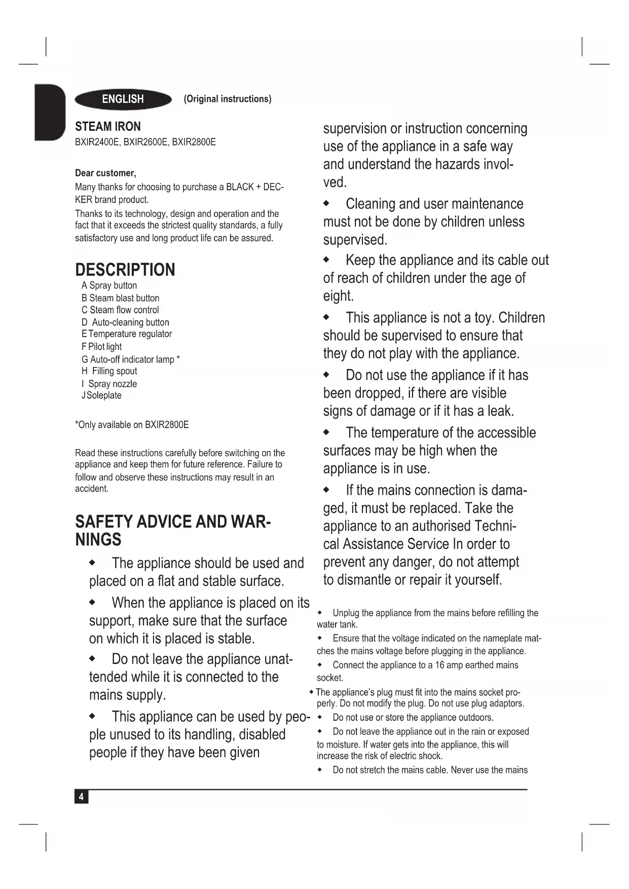 Dear customer, Many thanks for choosing to purchase a BLACK + DEC- KER brand product. Thanks to its technology, design and operation and the fact that it exceeds the strictest quality standards, a fully satisfactory use and long product life can be assured. DESCRIPTION A Spray button B Steam blast button C Steam ow control D Auto-cleaning button E Temperature regulator F Pilot light G Auto-off indicator lamp * H Filling spout I Spray nozzle J Soleplate *Only available on BXIR2800E Read these instructions carefully before switching on the appliance and keep them for future reference. Failure to follow and observe these instructions may result in an accident.