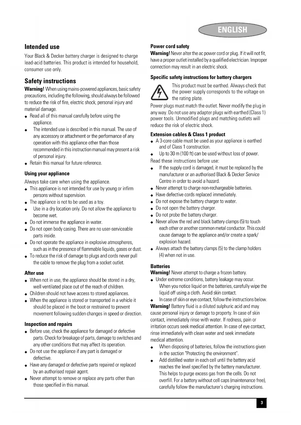 ENGLISH English Intended use Your Black & Decker battery charger is designed to charge lead-acid batteries. This product is intended for household, consumer use only. Safety instructions Warning! When using mains-powered appliances, basic safety precautions, including the following, should always be followed to reduce the risk of fire, electric shock, personal injury and material damage. X Read all of this manual carefully before using the appliance. X The intended use is described in this manual. The use of any accessory or attachment or the performance of any operation with this appliance other than those recommended in this instruction manual may present a risk of personal injury. X Retain this manual for future reference. Using your appliance Always take care when using the appliance. X This appliance is not intended for use by young or infirm persons without supervision. X The appliance is not to be used as a toy. X Use in a dry location only. Do not allow the appliance to become wet. X Do not immerse the appliance in water. X Do not open body casing. There are no user-serviceable parts inside. X Do not operate the appliance in explosive atmospheres, such as in the presence of flammable liquids, gases or dust. X To reduce the risk of damage to plugs and cords never pull the cable to remove the plug from a socket outlet. After use X When not in use, the appliance should be stored in a dry, well ventilated place out of the reach of children. X Children should not have access to stored appliances. X When the appliance is stored or transported in a vehicle it should be placed in the boot or restrained to prevent movement following sudden changes in speed or direction. Inspection and repairs X Before use, check the appliance for damaged or defective parts. Check for breakage of parts, damage to switches and any other conditions that may affect its operation. X Do not use the appliance if any part is damaged or defective. X Have any damaged or defective parts repaired or replaced by an authorised repair agent. X Never attempt to remove or replace any parts other than those specified in this manual. Power cord safety Warning! Never alter the ac power cord or plug. If it will not fit, have a proper outlet installed by a qualified electrician. Improper connection may result in an electric shock. Specific safety instructions for battery chargers This product must be earthed. Always check that the power supply corresponds to the voltage on the rating plate. Power plugs must match the outlet. Never modify the plug in any way. Do not use any adapter plugs with earthed (Class 1) power tools. Unmodified plugs and matching outlets will reduce the risk of electric shock. Extension cables & Class 1 product X A 3-core cable must be used as your appliance is earthed and of Class 1 construction. X Up to 30 m (100 ft) can be used without loss of power. Read these instructions before use: X If the supply cord is damaged, it must be replaced by the manufacturer or an authorised Black & Decker Service Centre in order to avoid a hazard. X Never attempt to charge non-rechargeable batteries. X Have defective cords replaced immediately. X Do not expose the battery charger to water. X Do not open the battery charger. X Do not probe the battery charger. X Never allow the red and black battery clamps (5) to touch each other or another common metal conductor. This could cause damage to the appliance and/or create a spark/ explosion hazard. X Always attach the battery clamps (5) to the clamp holders (4) when not in use. Batteries Warning! Never attempt to charge a frozen battery. X Under extreme conditions, battery leakage may occur. When you notice liquid on the batteries, carefully wipe the liquid off using a cloth. Avoid skin contact. X In case of skin or eye contact, follow the instructions below. Warning! Battery fluid is a diluted sulphuric acid and may cause personal injury or damage to property. In case of skin contact, immediately rinse with water. If redness, pain or irritation occurs seek medical attention. In case of eye contact, rinse immediately with clean water and seek immediate medical attention. X When disposing of batteries, follow the instructions given in the section "Protecting the environment". X Add distilled water in each cell until the battery acid reaches the level specified by the battery manufacturer. This helps to purge excess gas from the cells. Do not overfill. For a battery without cell caps (maintenance free), carefully follow the manufacturer's charging instructions.4 ENGLISH X Study all the battery manufacturer's specific precautions, such as removing or not removing cell caps while charging, and the recommended charging rates. X Make sure that the initial charging rate does not exceed the battery manufacturer's requirement. Warning! Risk of explosive gas mixtures. Working in the vicinity of a lead-acid battery is dangerous. Batteries generate explosive gases during normal battery operation. For this reason, it is of utmost importance that each time, before using your battery charger, you read this manual and follow the instructions exactly. X Use of an attachment not recommended or sold by Black & Decker may result in a risk of fire, electric shock, or injury to persons.