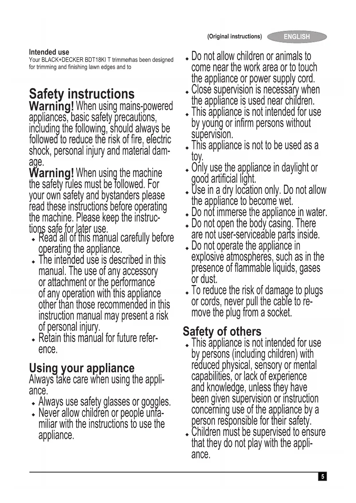 ENGLISH (Original instructions) Intended use Your BLACK+DECKER BDT18KI T trimmer for trimming and finishing lawn edges and to cut grass in confined spaces. This appliance is intended for consumer use only. Safety instructions Warning! When using mains-powered appliances, basic safety precautions, including the following, should always be shock, personal injury and material dam- age. Warning! When using the machine the safety rules must be followed. For your own safety and bystanders please read these instructions before operating the machine. Please keep the instruc- tions safe for later use.