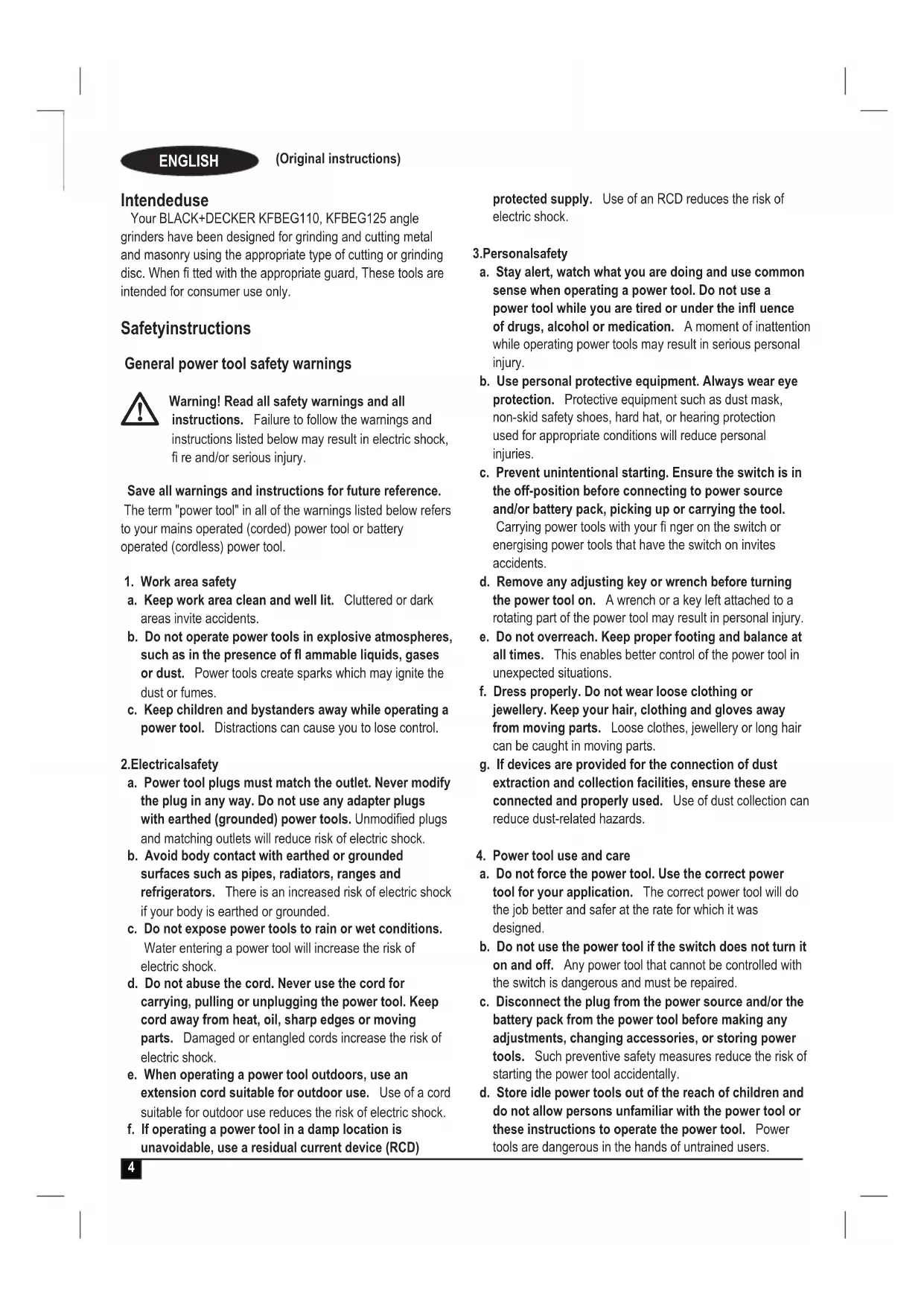 K L4 ENGLISH (Original instructions) Intended use Your BLACK+DECKER KFBEG110, KFBEG125 angle grinders have been designed for grinding and cutting metal and masonry using the appropriate type of cutting or grinding disc. When fi tted with the appropriate guard, These tools are intended for consumer use only. Safety instructions General power tool safety warnings