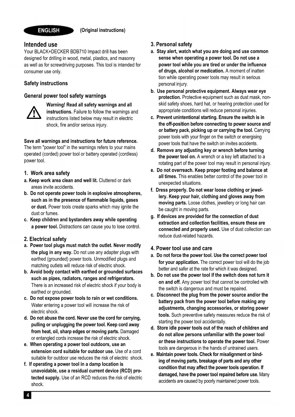 ENGLISH (Original instructions) Intended use Your BLACK+DECKER BDB710 Impact drill has been designed for drilling in wood, metal, plastics, and masonry as well as for screwdriving purposes. This tool is intended for consumer use only. Safety instructions General power tool safety warnings