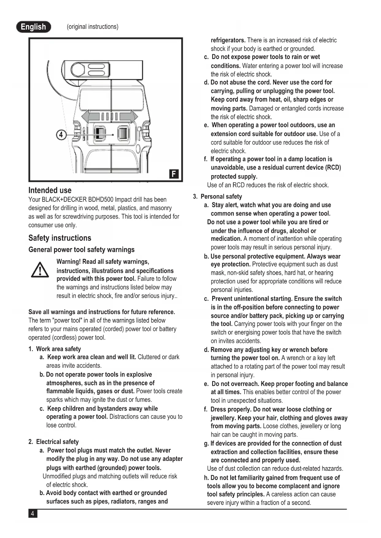 English (original instructions) Intended use Your BLACK+DECKER BDHD500 Impact drill has been designed for drilling in wood, metal, plastics, and masonry as well as for screwdriving purposes. This tool is intended for consumer use only. Safety instructions General power tool safety warnings