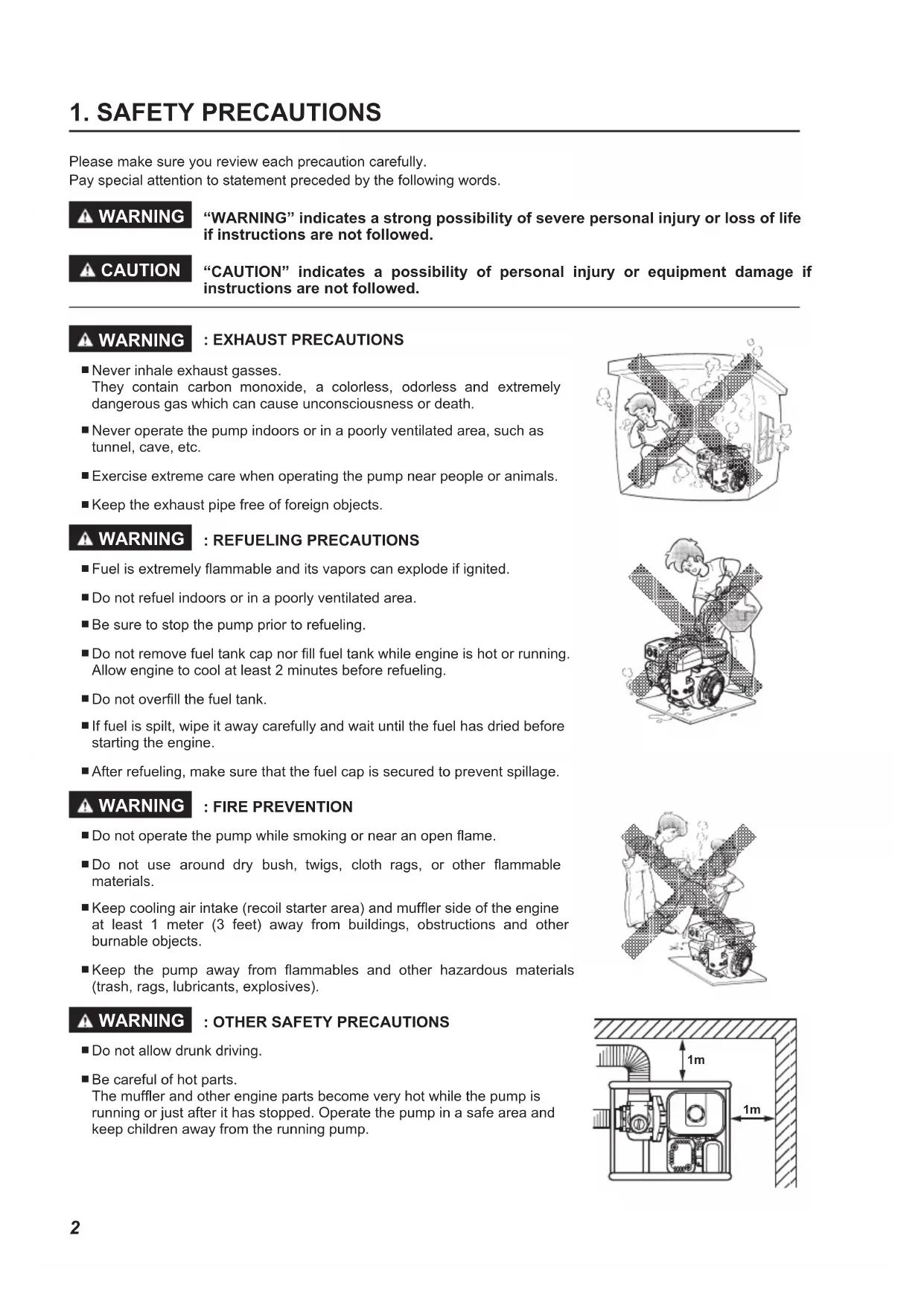 Be careful of hot parts. The mufer and other engine parts become very hot while the pump is running or just after it has stopped. Operate the pump in a safe area and keep children away from the running pump. WARNING CAUTION WARNING WARNING WARNING WARNING