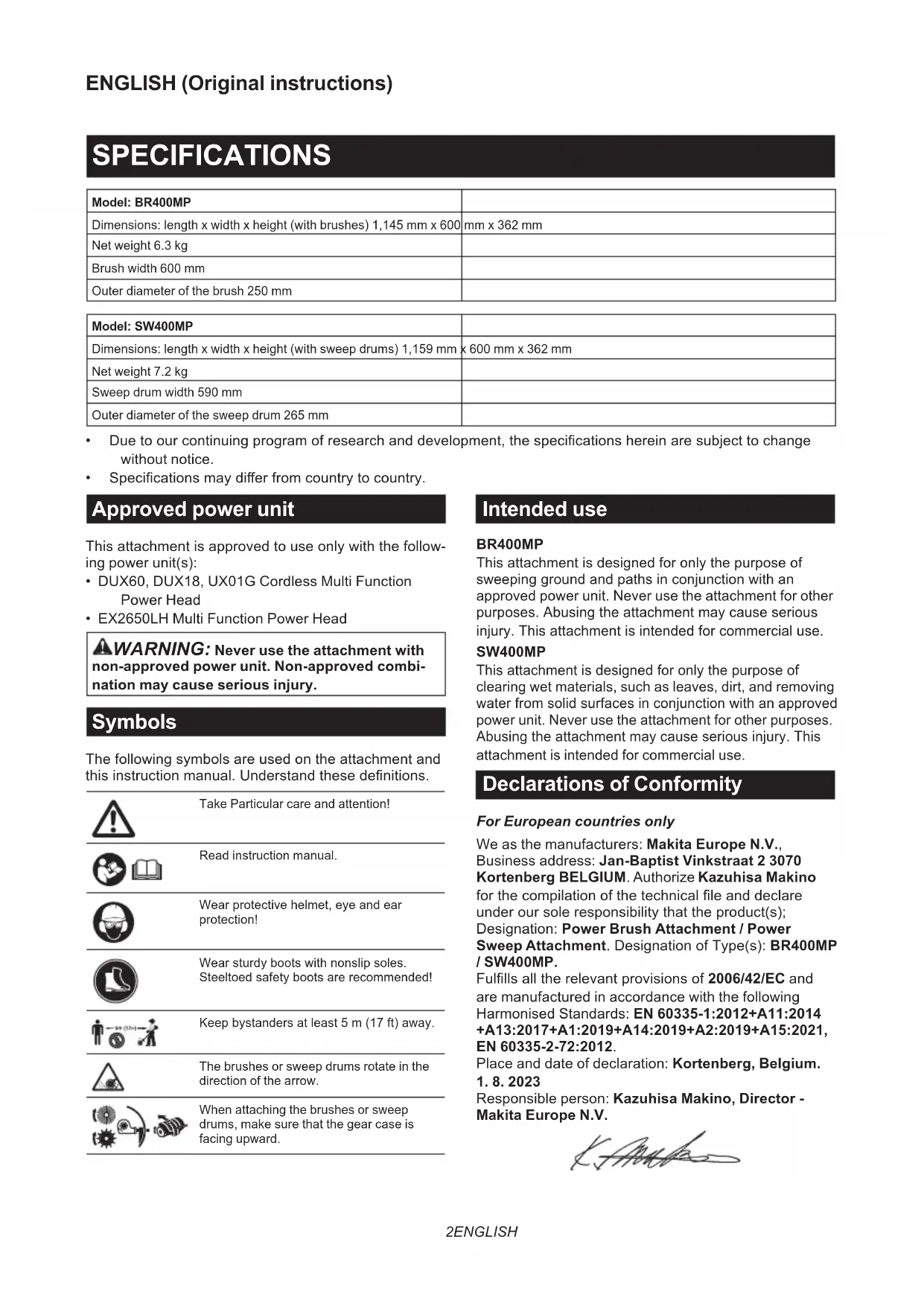 non-approved power unit. Non-approved combi- nation may cause serious injury. Symbols Thefollowingsymbolsareusedontheattachmentand thisinstructionmanual.Understandthesedenitions. Take Particular care and attention! Read instruction manual. Wearprotectivehelmet,eyeandear protection! Wearsturdybootswithnonslipsoles. Steeltoedsafetybootsarerecommended! Keepbystandersatleast5m(17ft)away. The brushes or sweep drums rotate in the direction of the arrow. When attaching the brushes or sweep drums, make sure that the gear case is facing upward. Intended use BR400MP Thisattachmentisdesignedforonlythepurposeof sweepinggroundandpathsinconjunctionwithan approved power unit. Never use the attachment for other purposes.Abusingtheattachmentmaycauseserious injury.Thisattachmentisintendedforcommercialuse. SW400MP Thisattachmentisdesignedforonlythepurposeof clearing wet materials, such as leaves, dirt, and removing waterfromsolidsurfacesinconjunctionwithanapproved power unit. Never use the attachment for other purposes. Abusingtheattachmentmaycauseseriousinjury.This attachment is intended for commercial use. Declarations of Conformity For European countries only We as the manufacturers: Makita Europe N.V., Business address: Jan-Baptist Vinkstraat 2 3070 Kortenberg BELGIUM. Authorize Kazuhisa Makino forthecompilationofthetechnicalleanddeclare underoursoleresponsibilitythattheproduct(s); Designation: Power Brush Attachment / Power Sweep Attachment.DesignationofType(s):BR400MP / SW400MP. Fulllsalltherelevantprovisionsof2006/42/EC and are manufactured in accordance with the following Harmonised Standards: EN 60335-1:2012+A11:2014 +A13:2017+A1:2019+A14:2019+A2:2019+A15:2021, EN 60335-2-72:2012. Place and date of declaration: Kortenberg, Belgium.